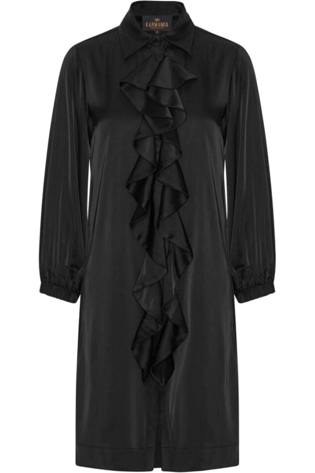 Sort kjole fra Karmamia med rynket front og ruffles. Kjolen har skjortekrave og trekvartlange ærmer med elastik ved manchetterne. Den går til knæet og har en regular pasform.