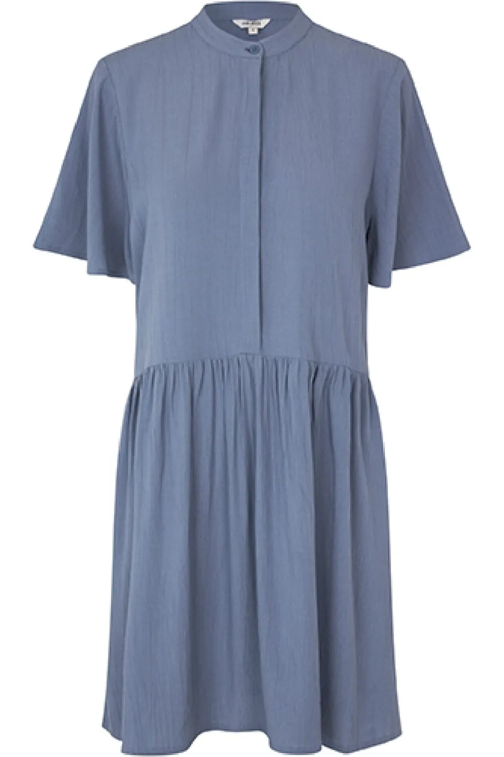 Blågrå kjole fra MbyM med skjortekrave og korte ærmer. Kjolen har knaplukning foran og en udsat nederdel, der giver et let og luftigt udtryk.