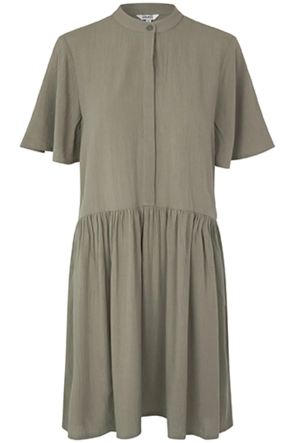 Kjole fra MbyM i en dæmpet grøn nuance. Den har skjortekrave, knapper foran og korte ærmer. Nederdelen falder løst fra taljen med et let og luftigt udtryk.