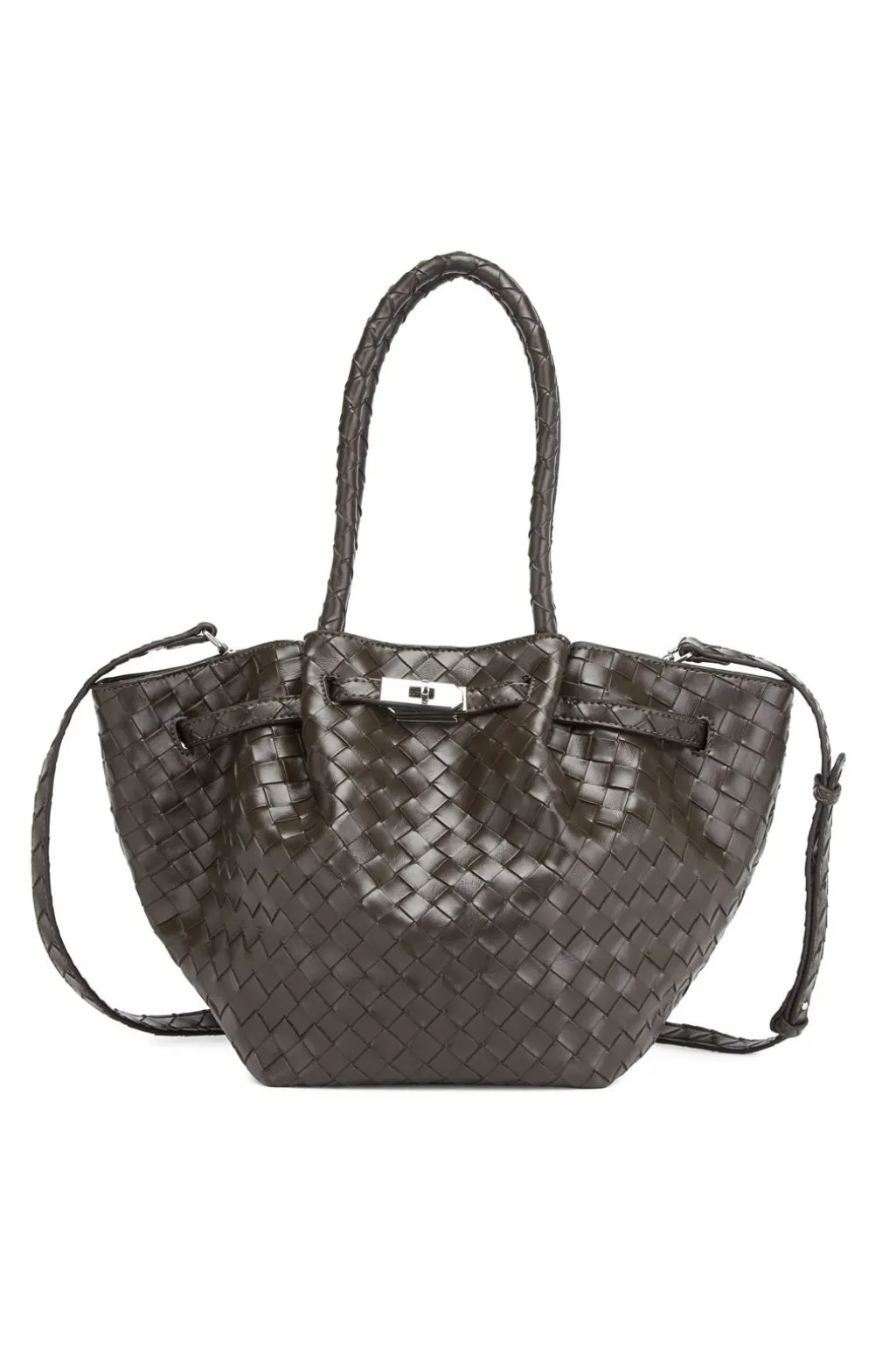 Stor taske fra Noella i mørkebrun med flettet mønster. Tasken har to håndtag og en aftagelig skulderrem.