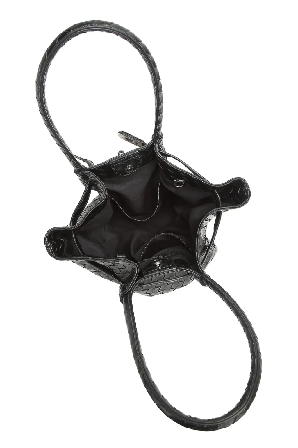 Sort taske fra Noella, lavet af 100 % polyurethan med et flettet design over hele overfladen. Tasken har to lange hanke og detaljer i børstet sølv.