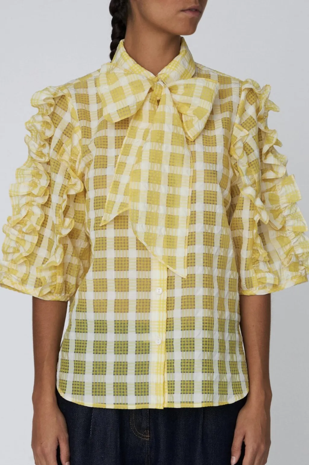 Ternet skjorte fra Stella Nova i gul og hvid. Skjorten har en stor sløjfe ved kraven og flæsedetaljer på ærmerne. Den er lavet med 3/4-ærmelængde og knaplukning foran.