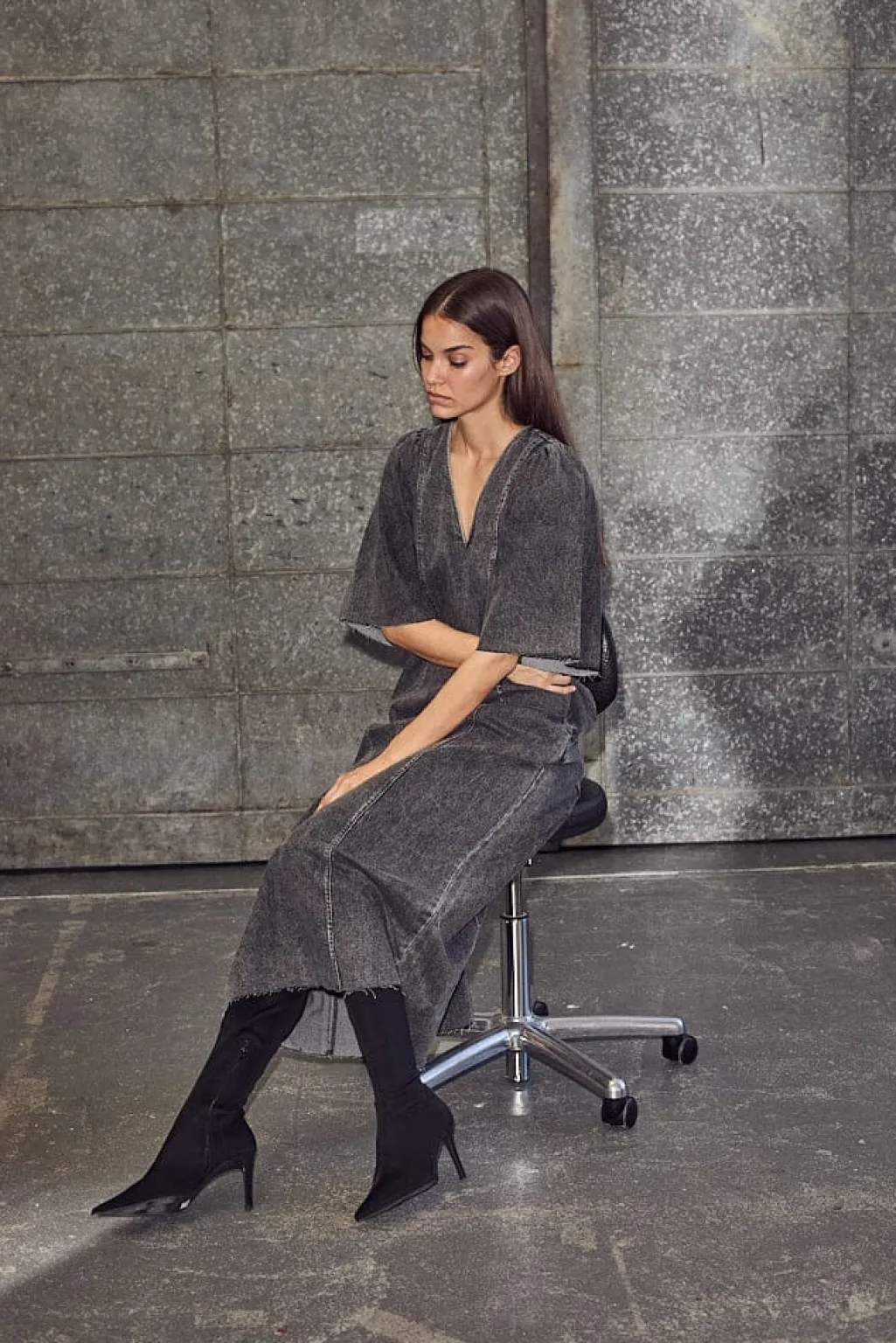 Sort denimkjole fra Haute L’Amitié i Washed Black. Kjolen har en vasket effekt med dekorative syninger og broderier.