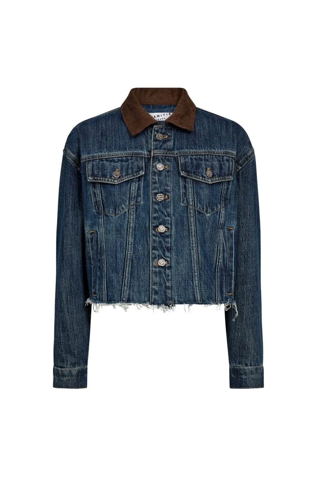 Cropped denimjakke fra Haute L’Amitié i bleget denim med brun krave. Jakken har to brystlommer med knaplukning og en frynset kant forneden.