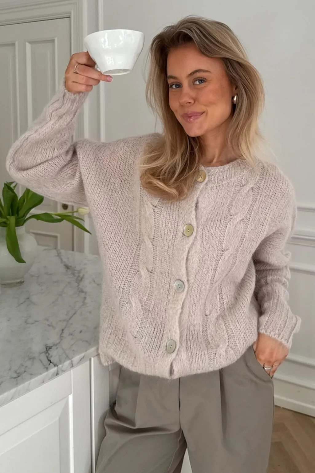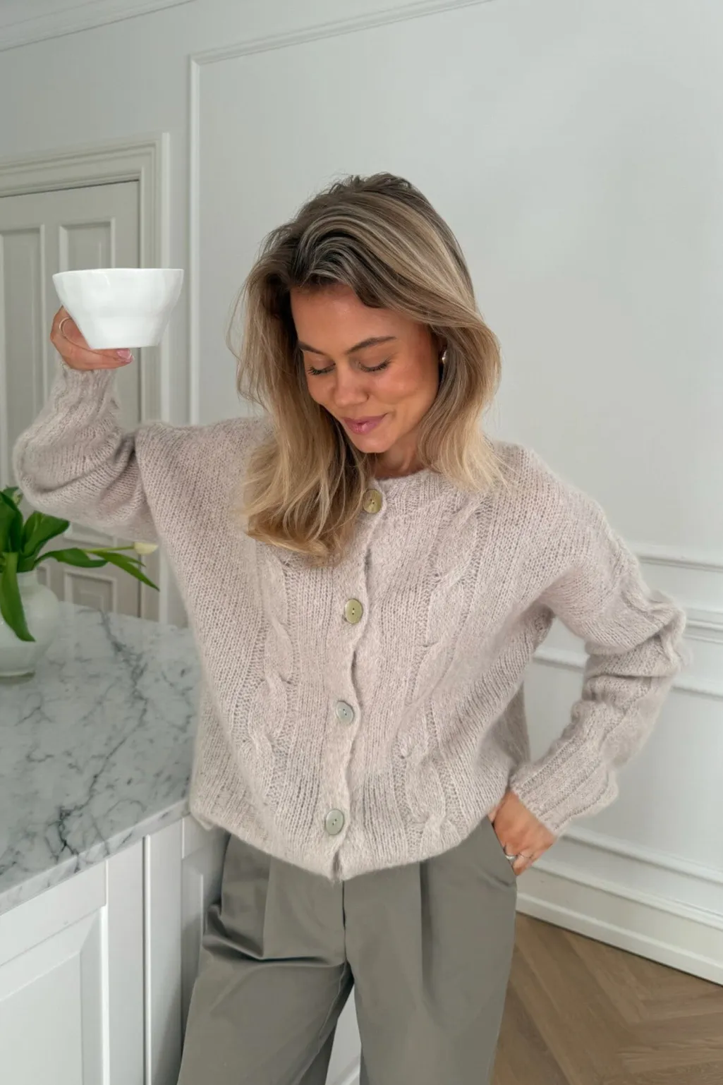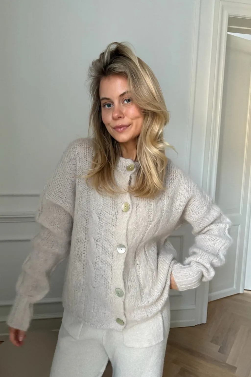 Beige cardigan fra BYIC med kabelstrik på forsiden. Den bløde strik har dekorative syninger og knapper i lysegrøn og creme, som giver et personligt præg.