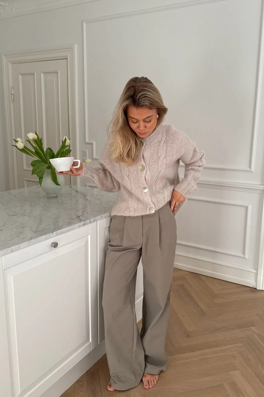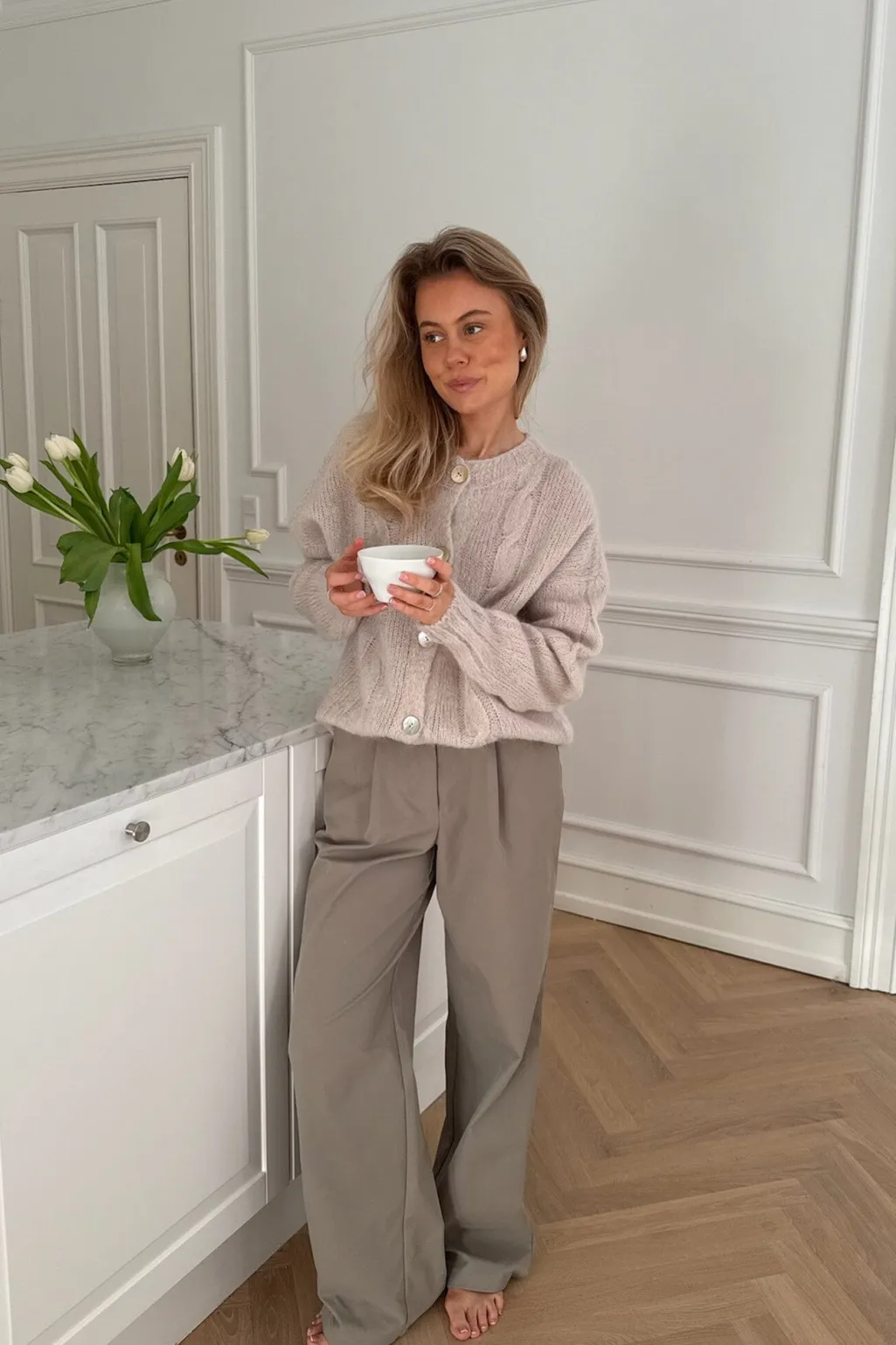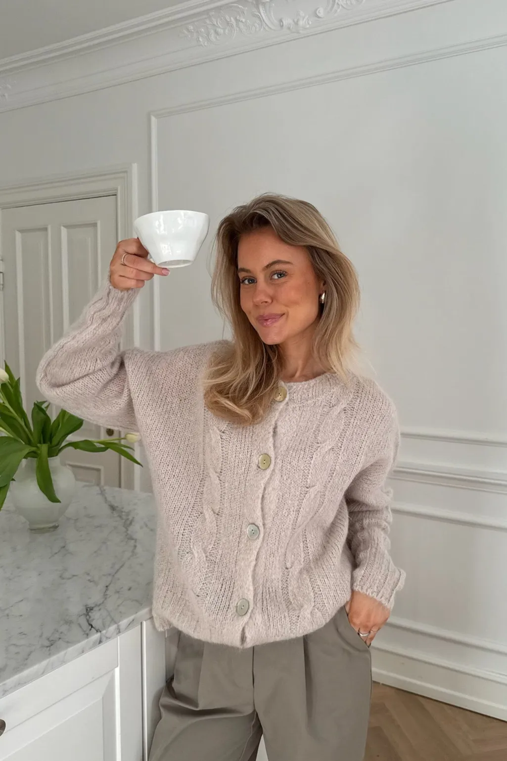 Beige cardigan fra BYIC med kabelstrik på forsiden. Den bløde strik har dekorative syninger og knapper i lysegrøn og creme, som giver et personligt præg.