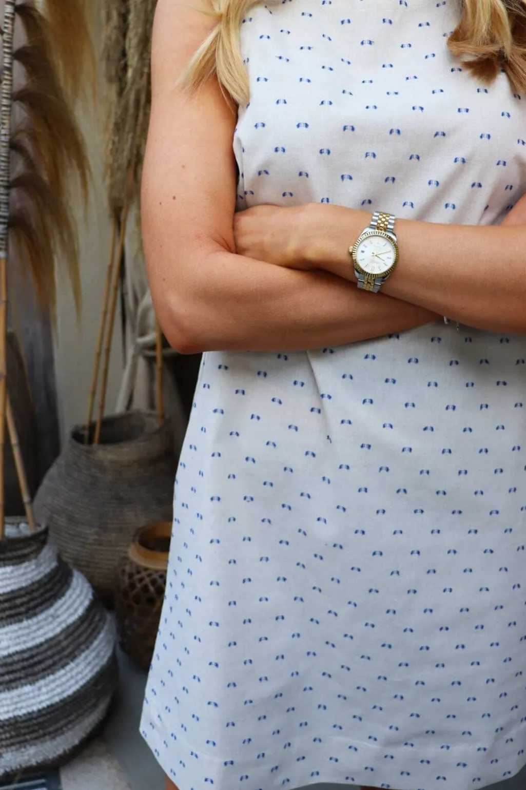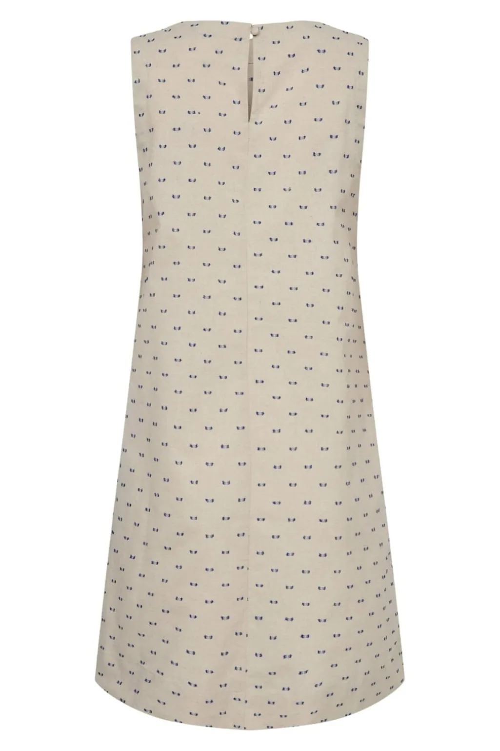 Ærmeløs kjole fra Liberte med blå prikker på lys baggrund. Kjolen har en rund halsudskæring og lige skæring til lårene.