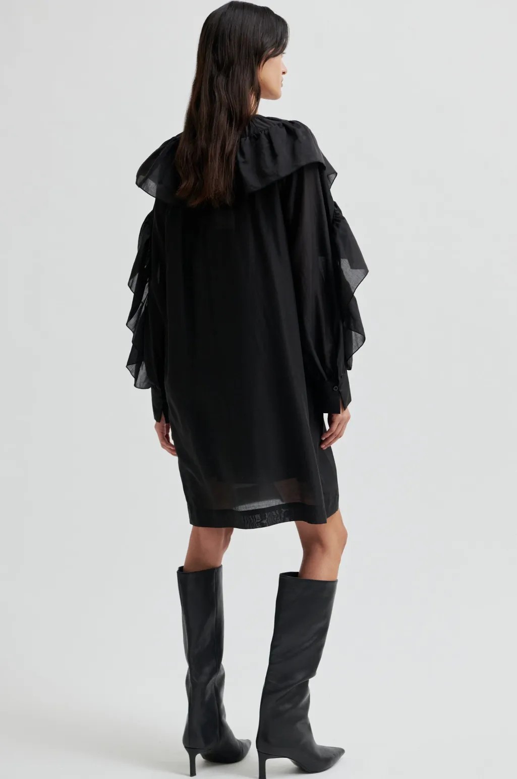 Sort kjole fra Second Female med diagonale flæsedetaljer ved halsudskæringen og ærmerne. Kjolen har en løs pasform og er lavet af let, semitransparent materiale.