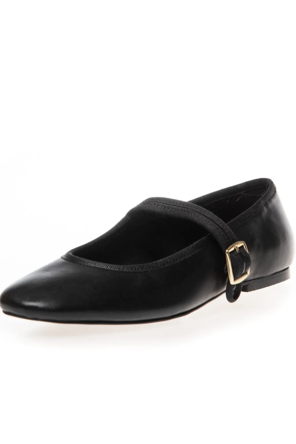 Sort lædersko med spændelukning fra Copenhagen Shoes. Skoen har en spids tå og lav hæl, der gør den praktisk til både formelle og festlige anledninger.