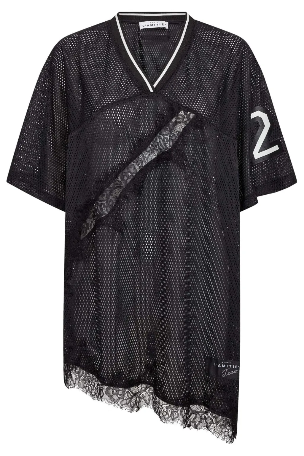 Sort t-shirt fra Haute L’Amitié med asymmetrisk blondedetalje forneden. V-hals med hvid kant og oversized pasform giver et anderledes udtryk.