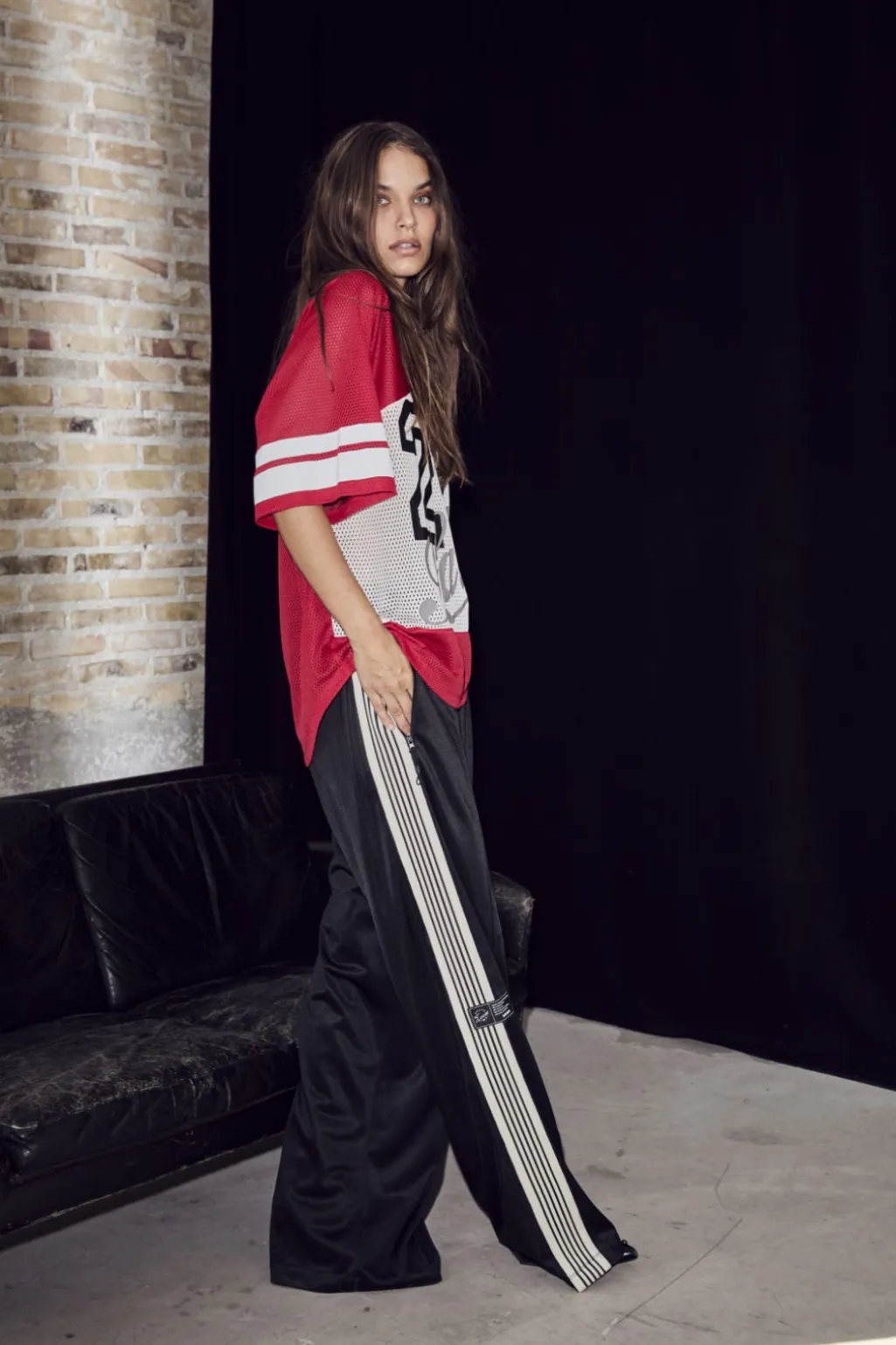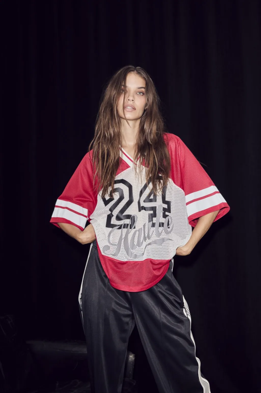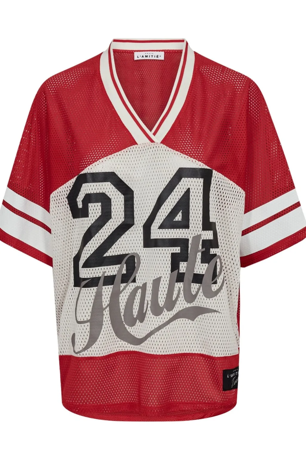 Rød t-shirt fra Haute L’Amitié med stort nummerprint på brystet. Den har en sporty baseballstil med V-hals og hvide kontrastdetaljer.