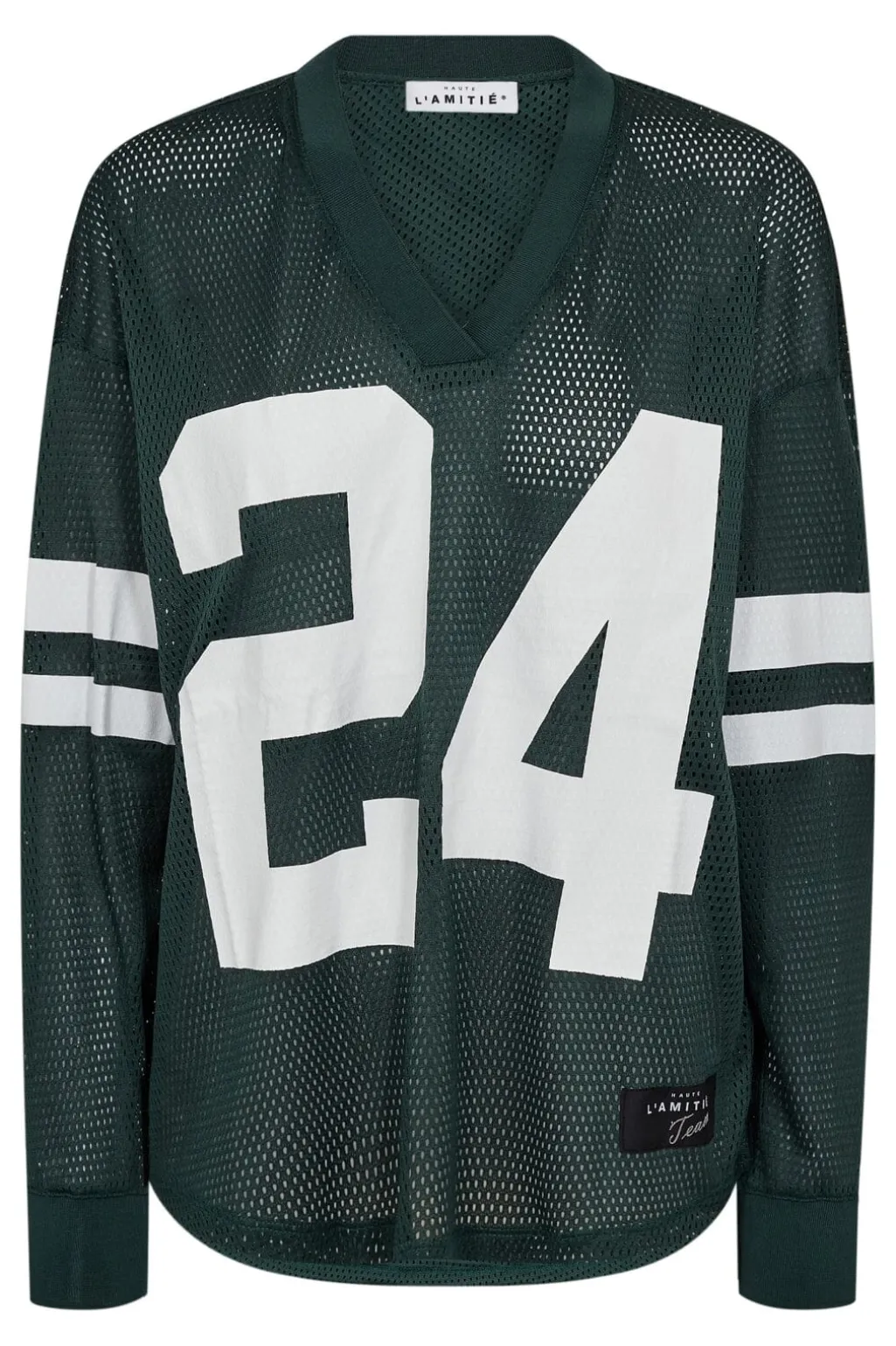 Langærmet t-shirt fra Haute L’Amitié i sporty grøn. Designet har hvide striber på ærmerne og et stort hvidt 24 på forsiden.