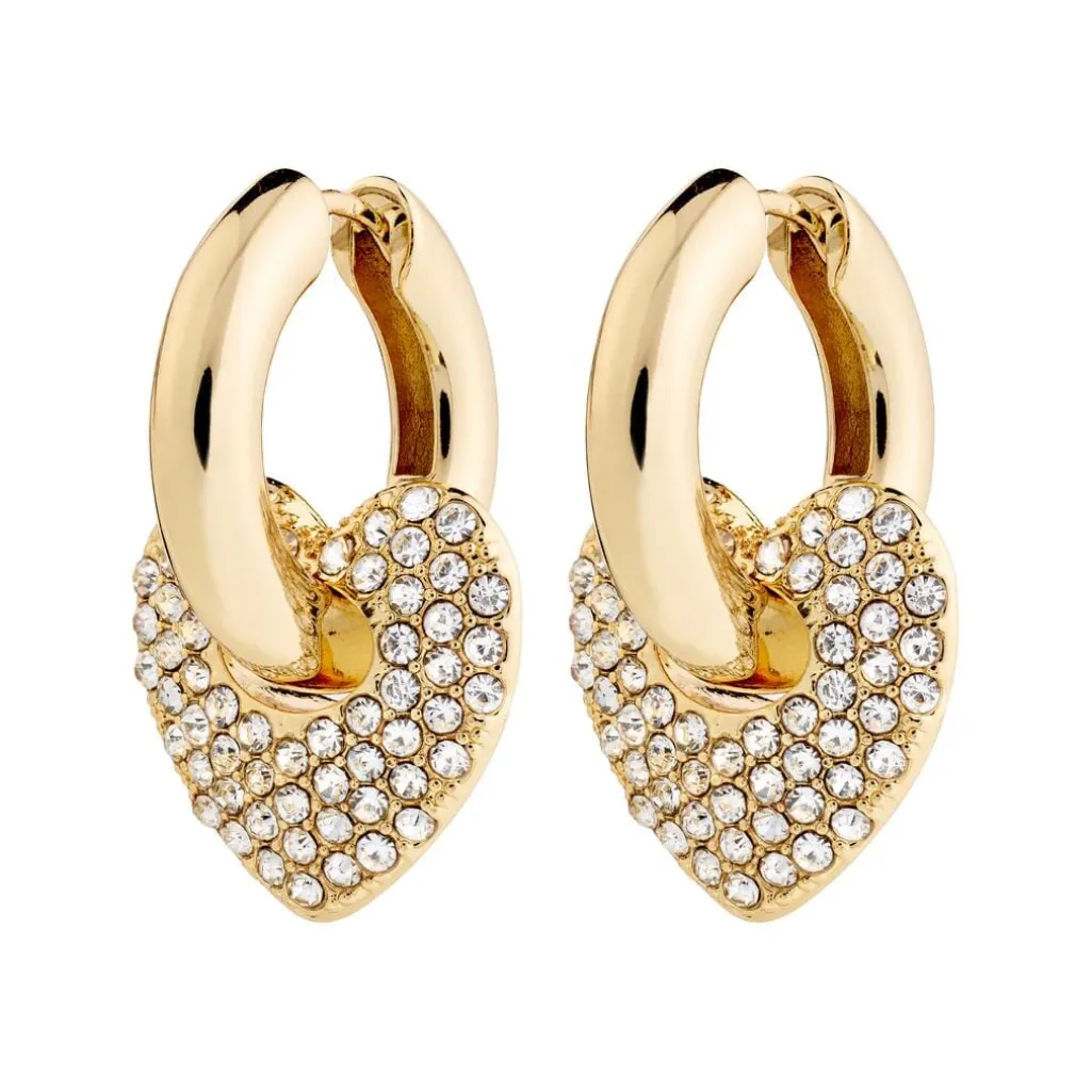 Guldbelagte øreringe fra Pilgrim med hjerteform. Øreringene har små krystaller, der dækker hele hjertefladen og skaber et funklende udtryk.