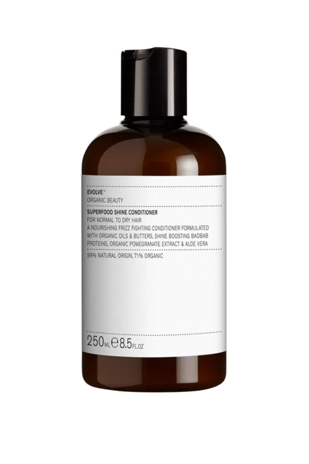 Balsam fra Evolve med proteiner fra baobabtræet og økologisk granatæble. Balsamen er udviklet til normalt til tørt hår og indeholder beroligende aloe vera.