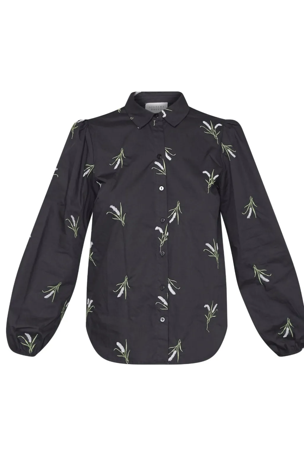 Bluse fra Sisters Point i sort bomuld med broderet blomstermønster. Blusen har en klassisk krave og lange ærmer med smock-design.
