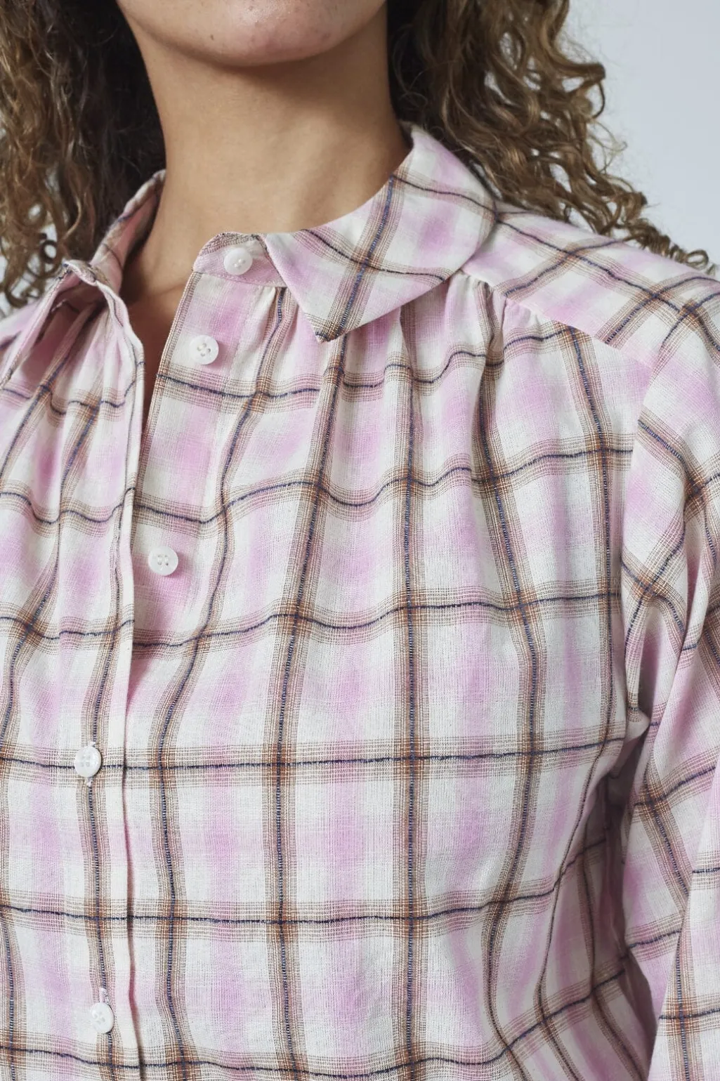 Skjorte fra Sisters Point i lyserød tern. Den har en klassisk krave og lange ærmer med rynkedetaljer ved skuldrene. Skjorten lukkes med knapper hele vejen ned foran.