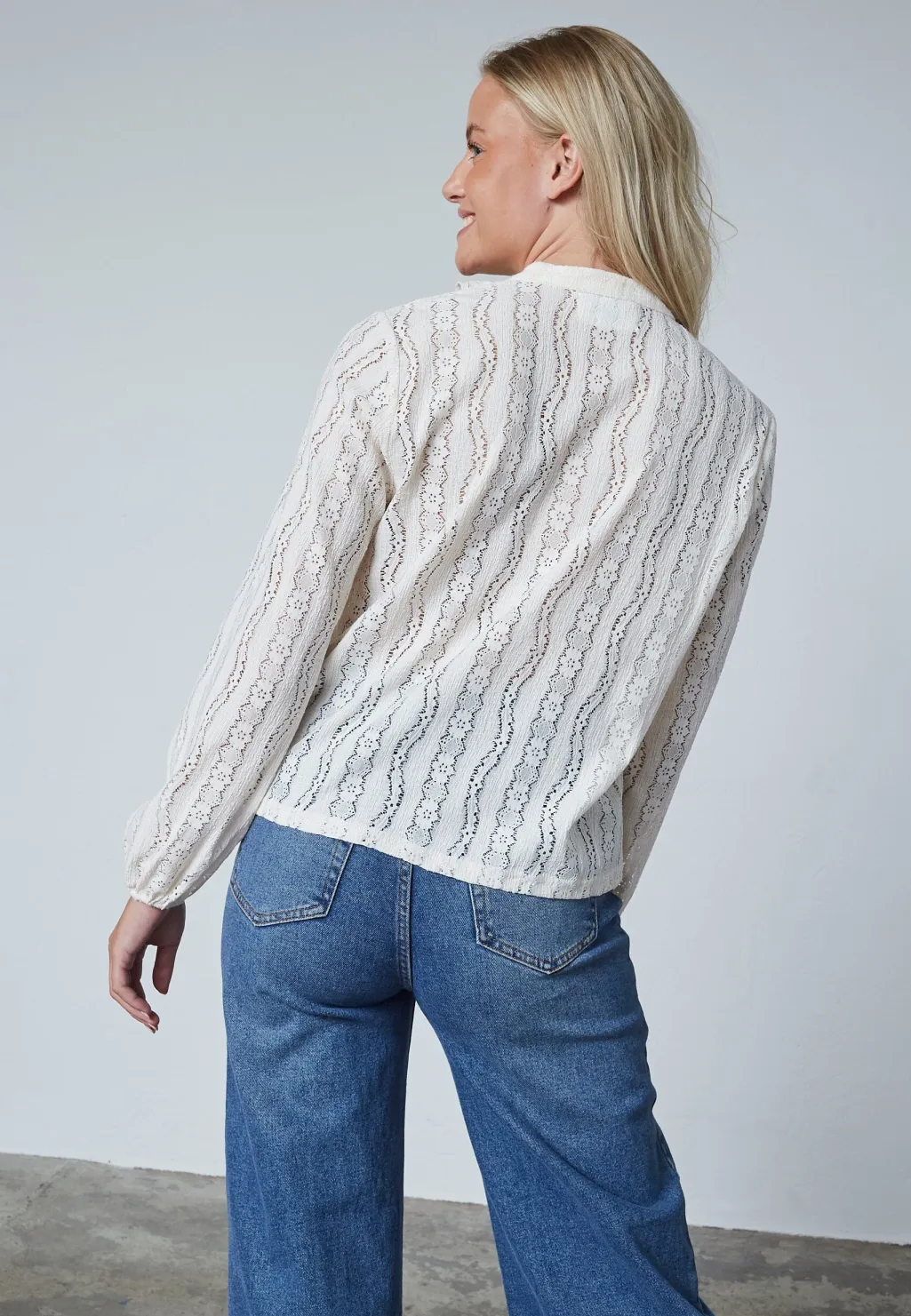 Cremefarvet bluse fra Sisters Point med et lodret blondemønster. Blusen har lange ærmer, V-udskæring med flæser og knaplukning foran.