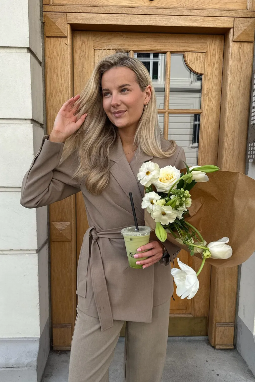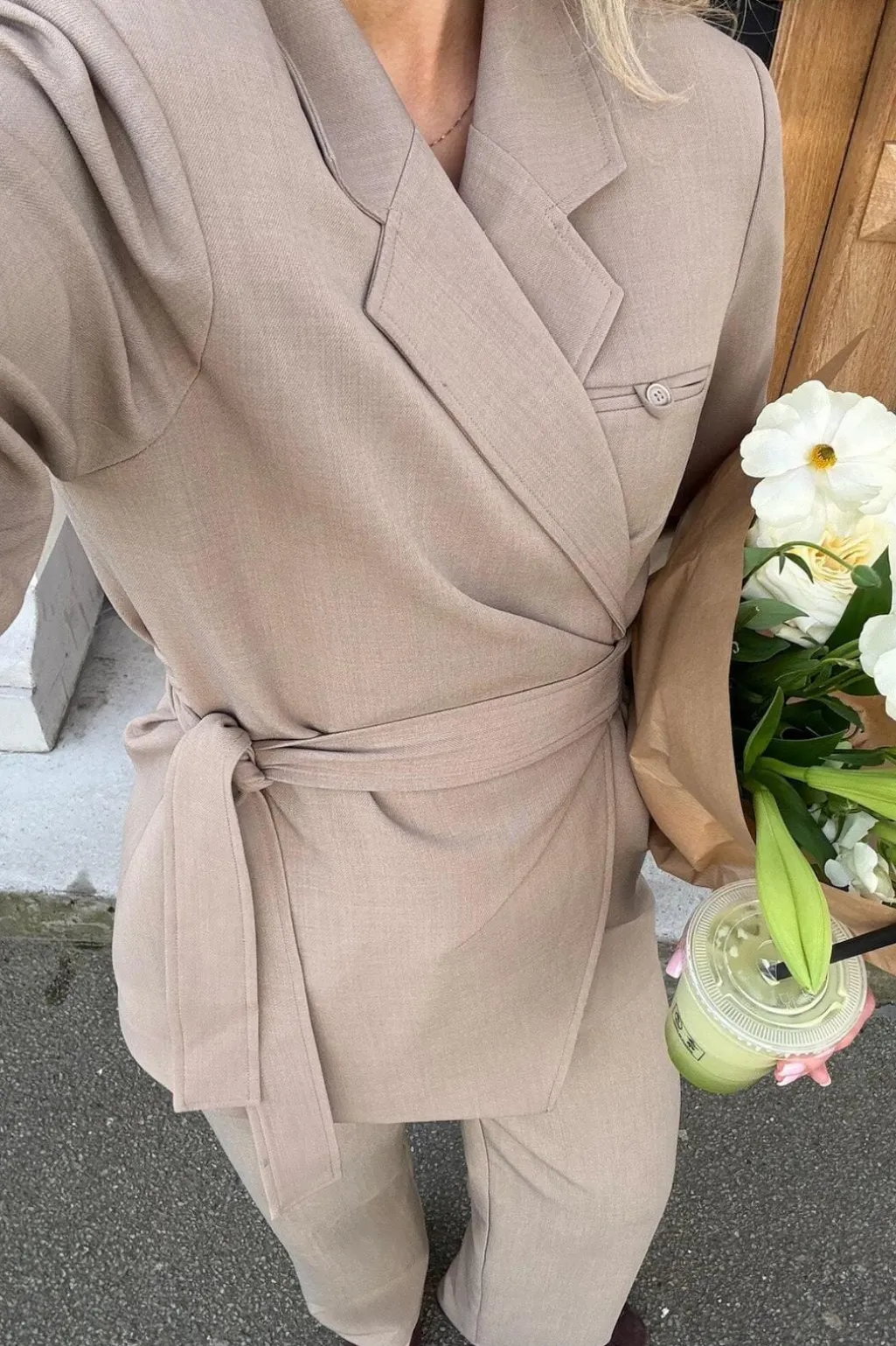 Lysebrun blazer fra BYIC med omslagsdesign og bindebælte i taljen. Blazeren har skulderpuder, lige ærmer og en lille brystlomme på venstre side.