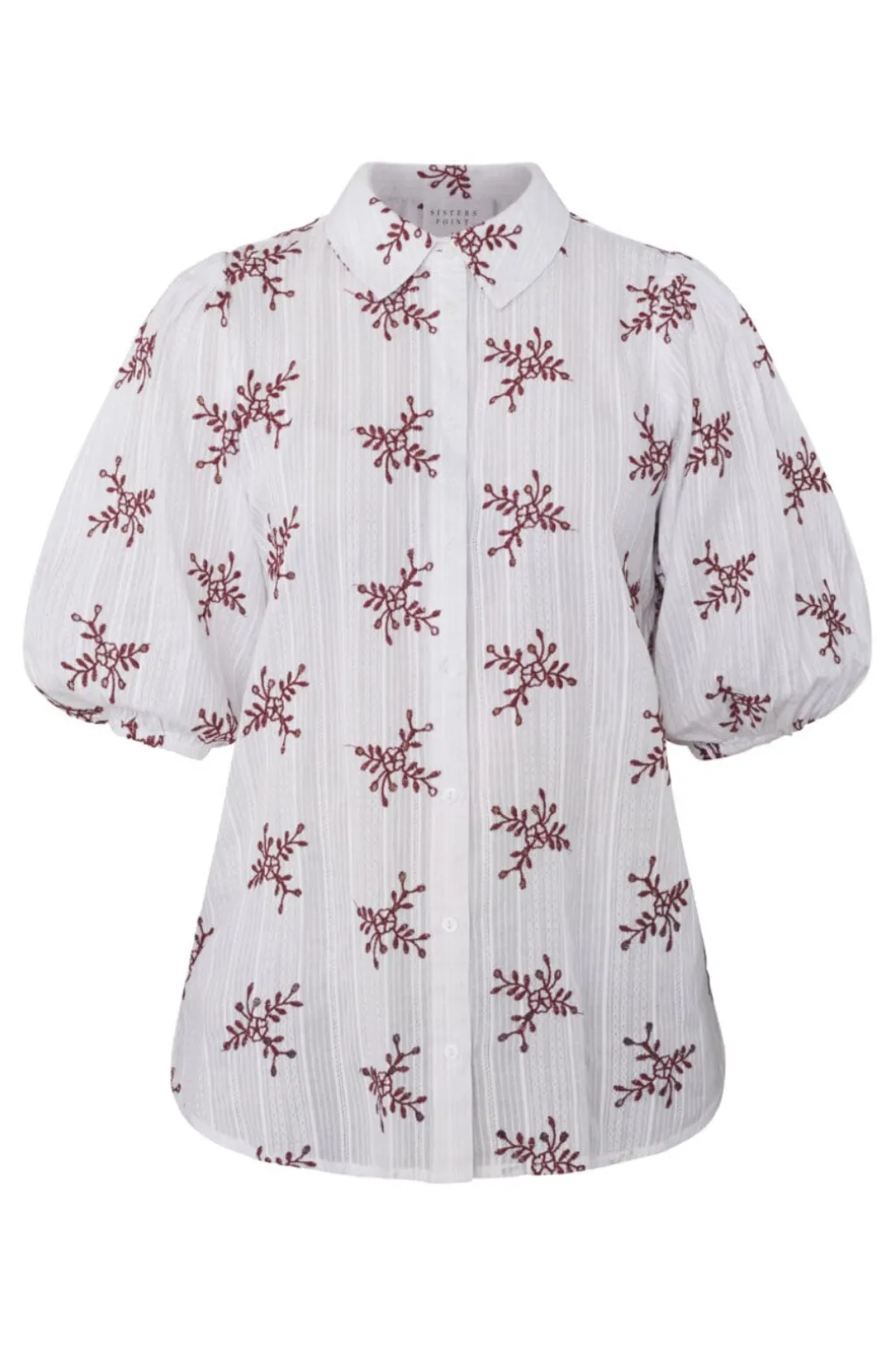 Hvid bluse fra Sisters Point med bordeauxfarvet blomsterbroderi. Den har skjortekrave, knaplukning foran og korte pufærmer i et let vævet materiale.
