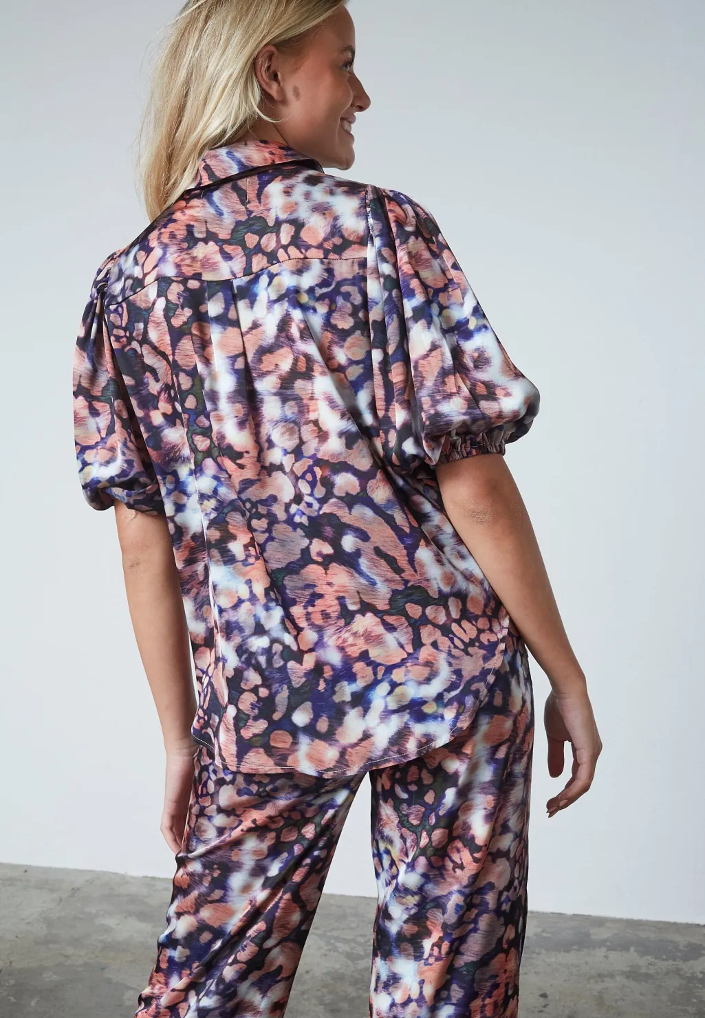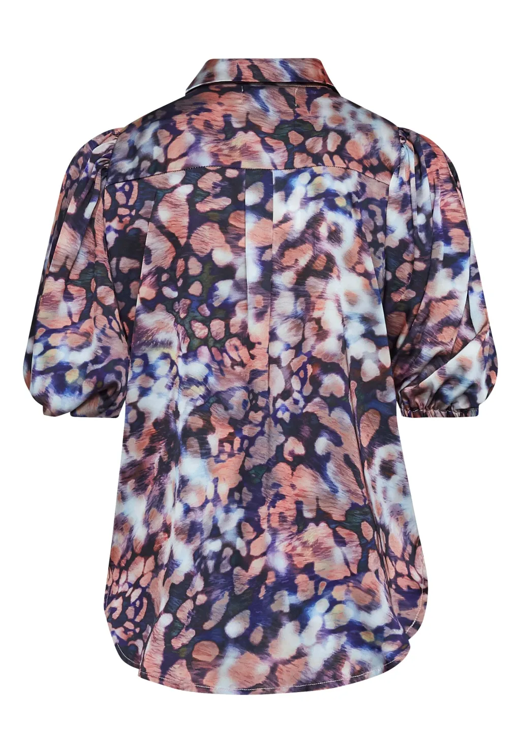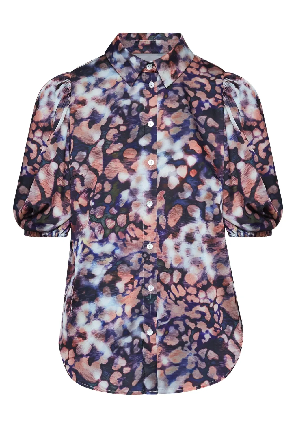 Skjorte fra Sisters Point med et farverigt, abstrakt mønster i nuancer af blå, pink og sort. Skjorten har korte puffærmer og en klassisk spids krave.