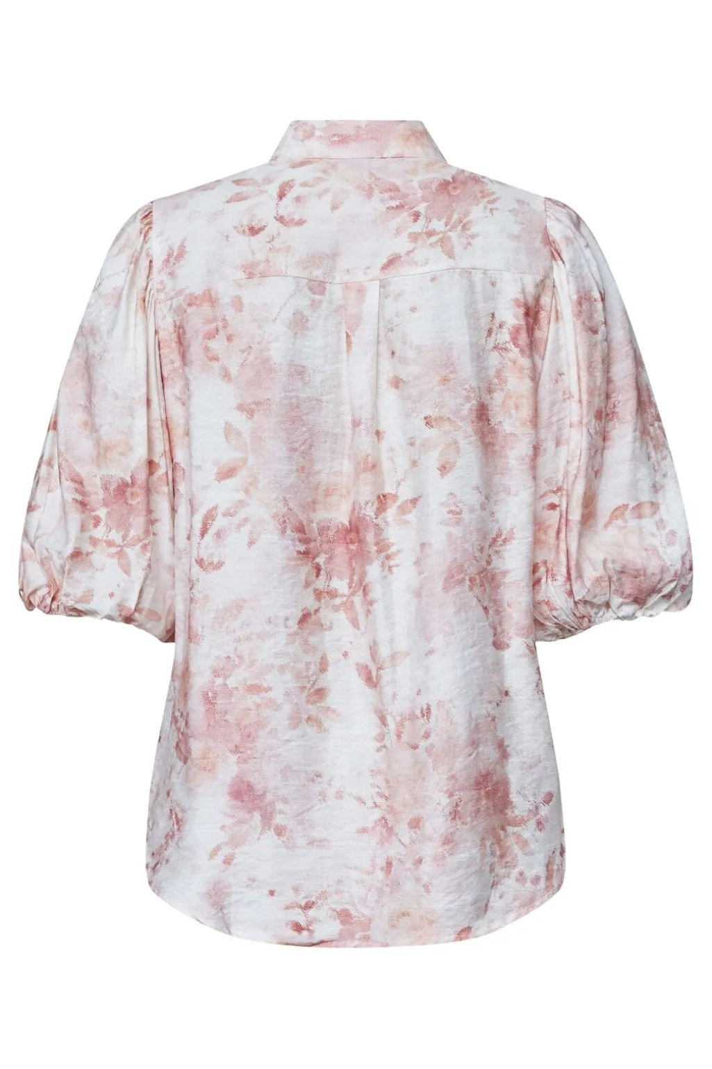 Skjorte fra Sisters Point med blomsterprint i lyserød og orange på hvid bund. Den har pufærmer i 3/4 længde, skjortekrave og knaplukning foran.