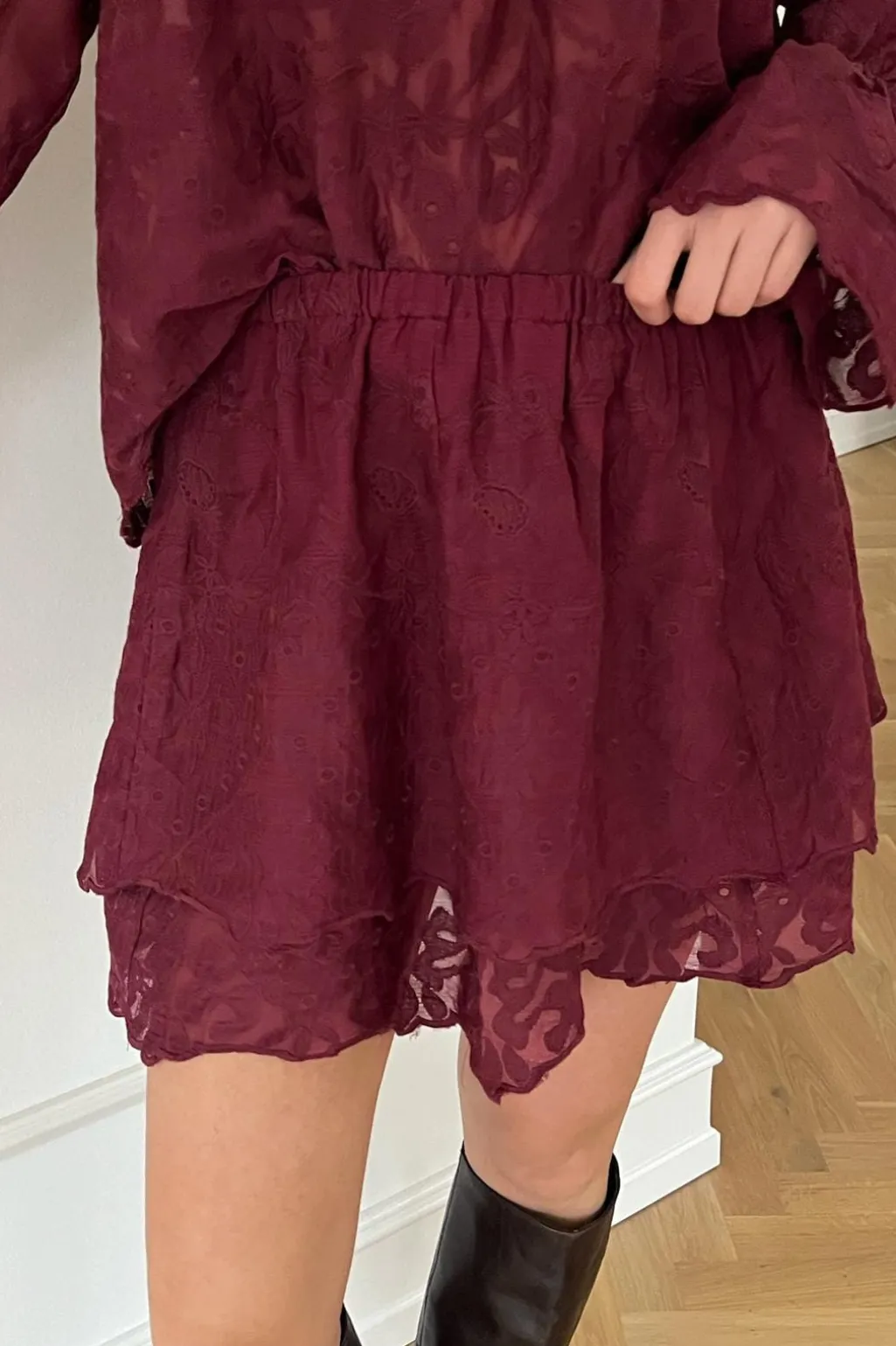 Blondenederdel fra BYIC i dyb bordeauxfarve. Den har to lag blonde med flæser og blomstermønster. Den elastiske talje giver god bevægelsesfrihed.