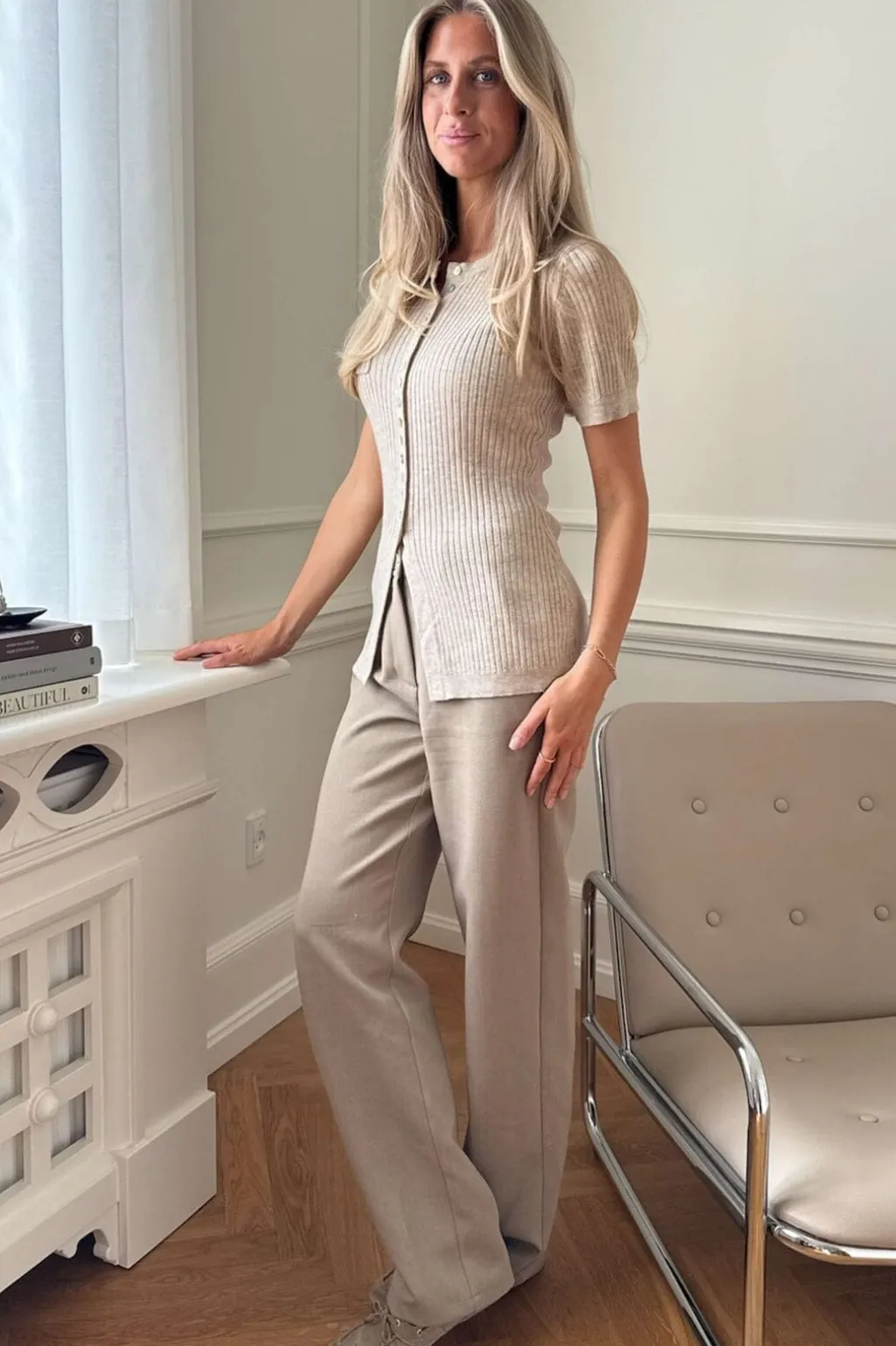 Beige cardigan fra BYIC med korte ærmer og ribstrikket mønster. Den har knapper hele vejen ned foran og en lille lomme på brystet. Slidsdetaljen i bunden giver god bevægelsesfrihed.