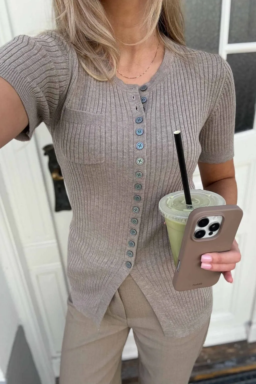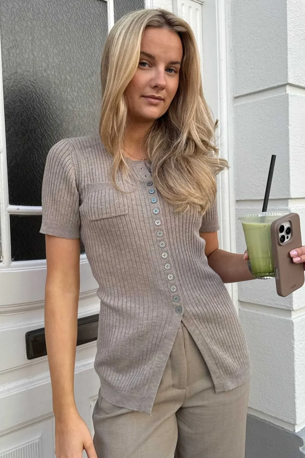 Lysebrun cardigan med korte ærmer og ribstrikket design. Den har knaplukning hele vejen ned foran og en lille brystlomme. En slids i bunden giver god bevægelighed.