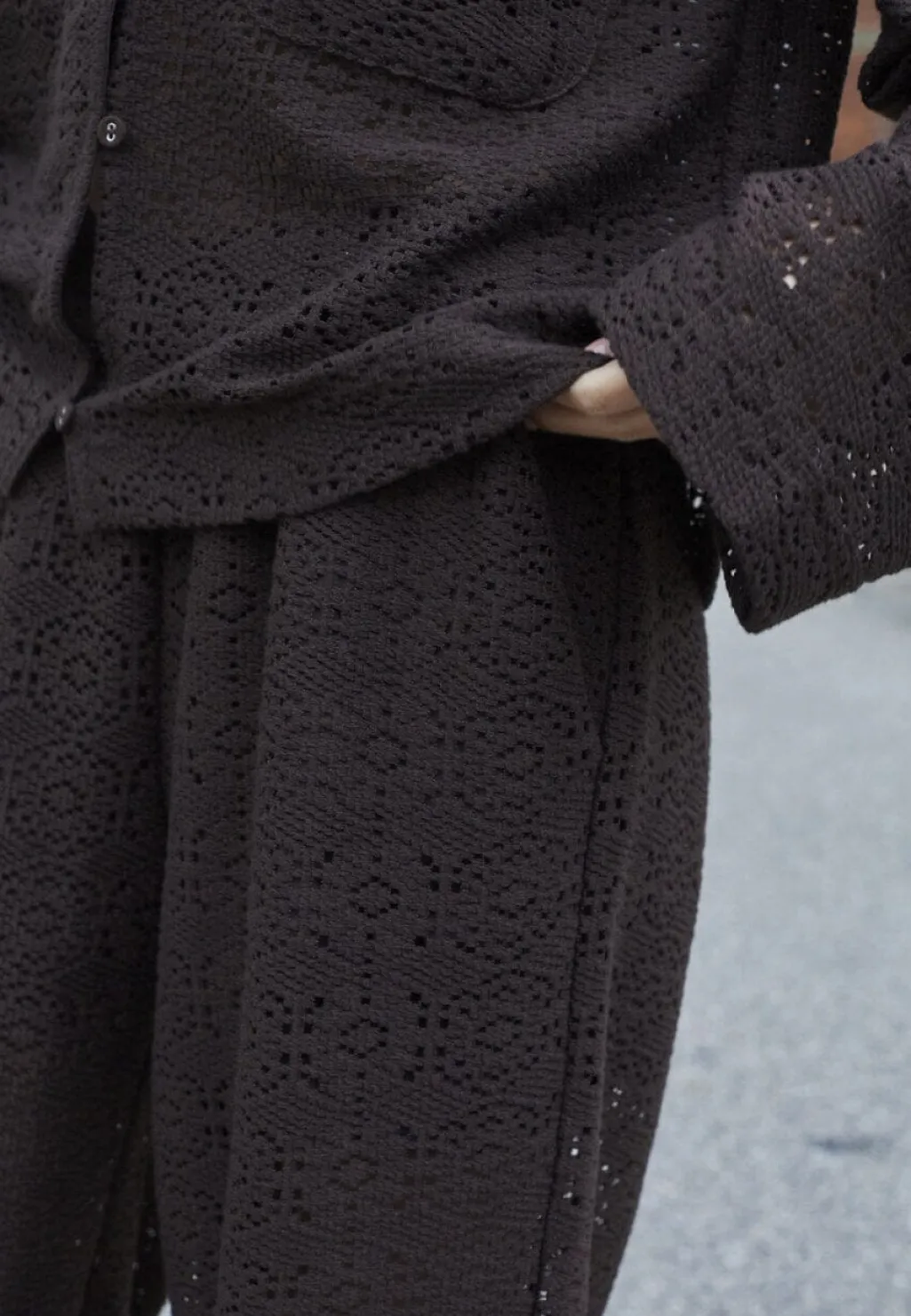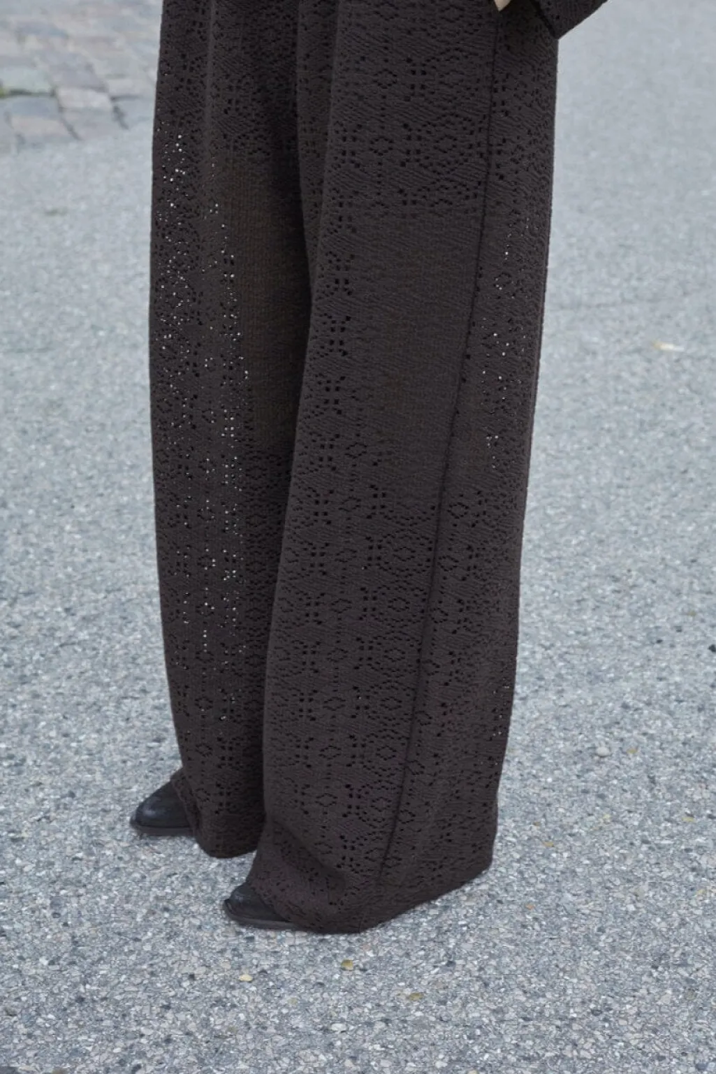 Bukser fra Sisters Point i mørkebrun farve med blondedetaljer. Bukserne har et fint, gennemvævet mønster og er lavet af en blanding af polyester og bomuld.