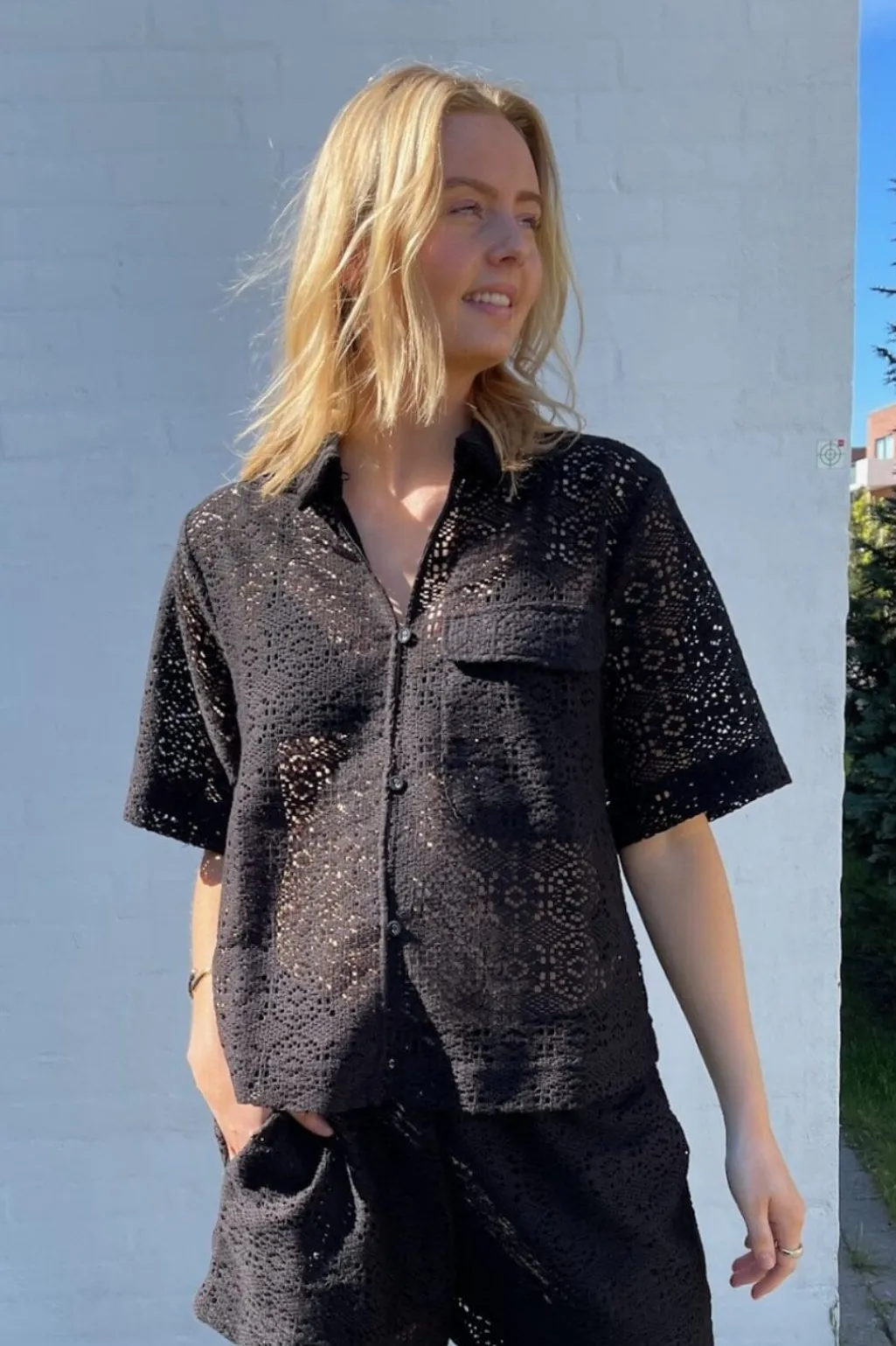Sort skjorte fra Sisters Point med korte ærmer. Skjorten har et fint, gennemvævet mønster og en klassisk skjortekrave med knapper ned foran.