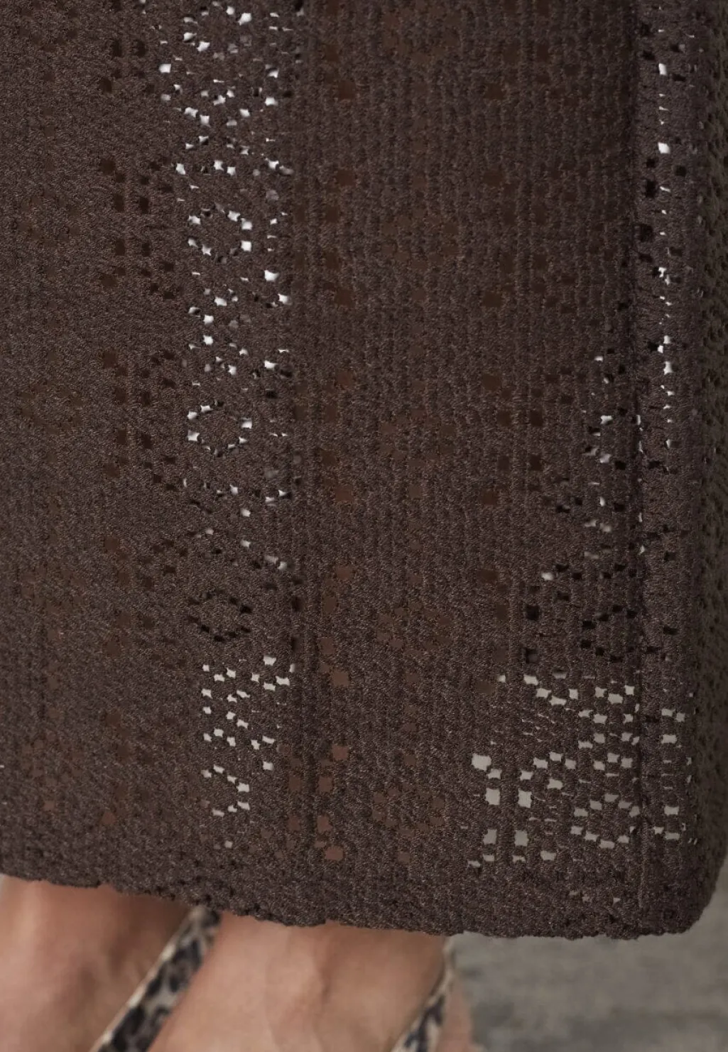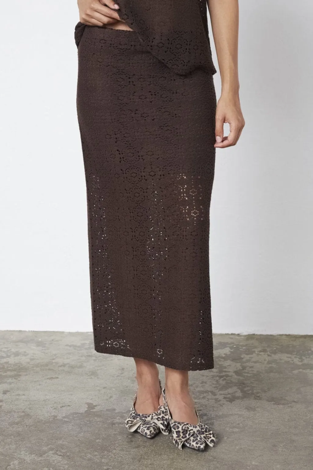 Nederdel fra Sisters Point i mørkebrun nuance med hulmønster i hele stoffet. Nederdelen har en lang længde og en ensfarvet bund.