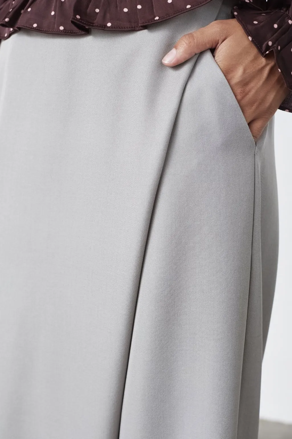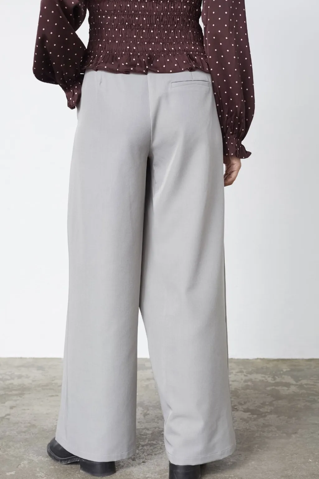 Lysegrå bukser fra Sisters Point med ankel-længde og høj talje. Bukserne har et overlappende design foran og brede ben med lommer.