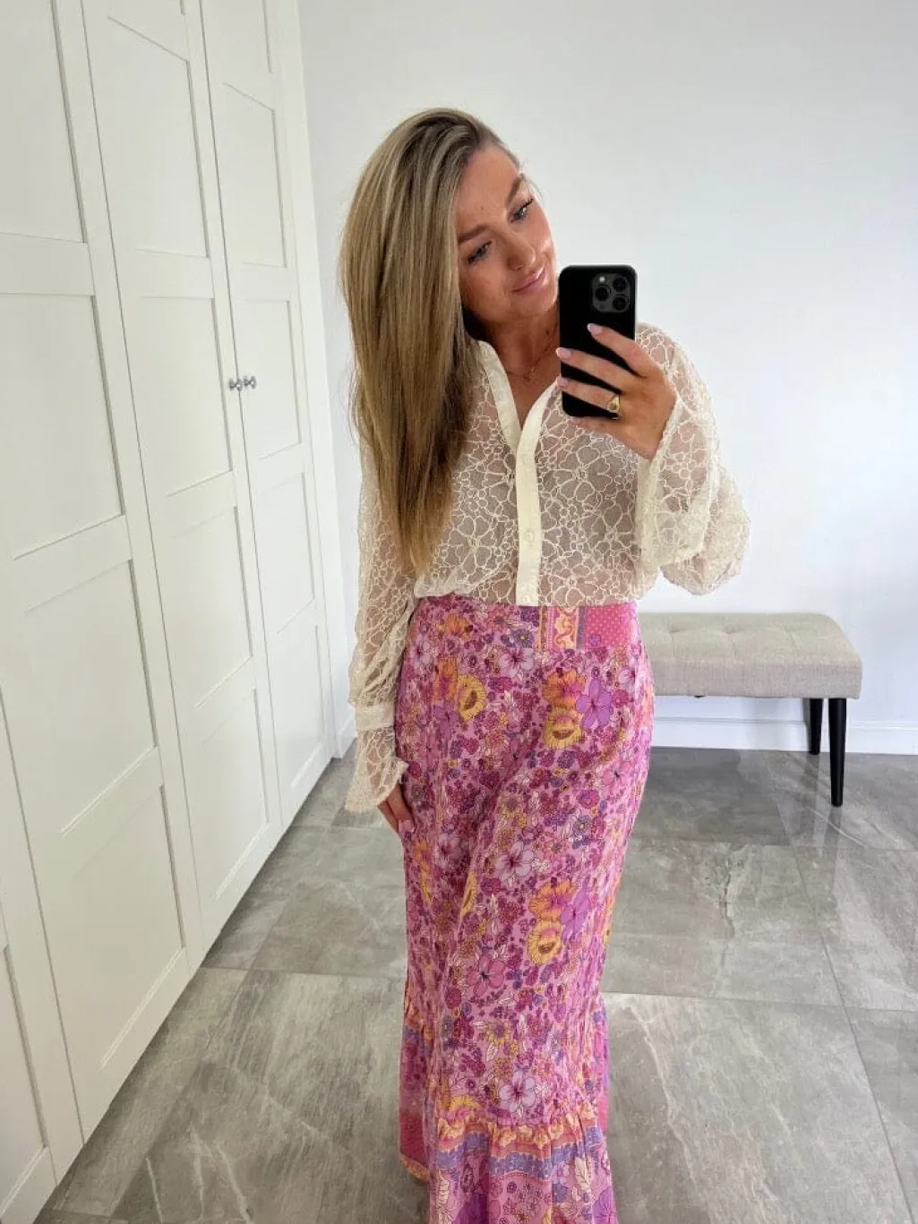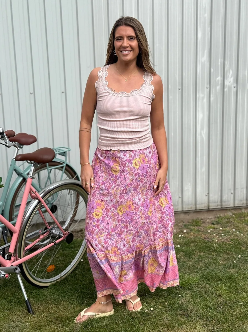 Pink maksiskørt fra Dear Molly med blomstermønster i pink og lilla nuancer. Skørtet har en løs pasform og en flæsekant forneden, der giver et blødt og feminint udtryk.