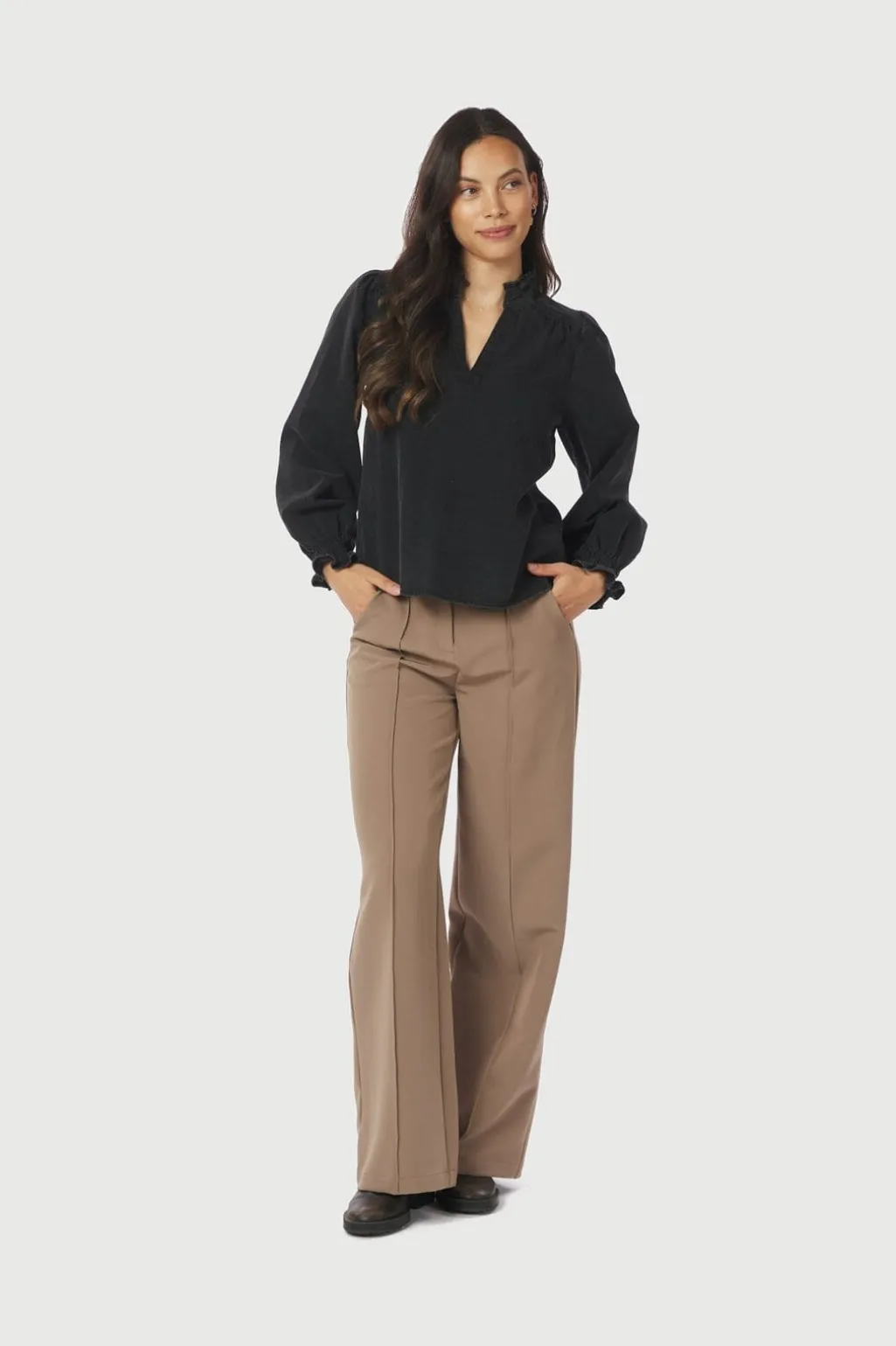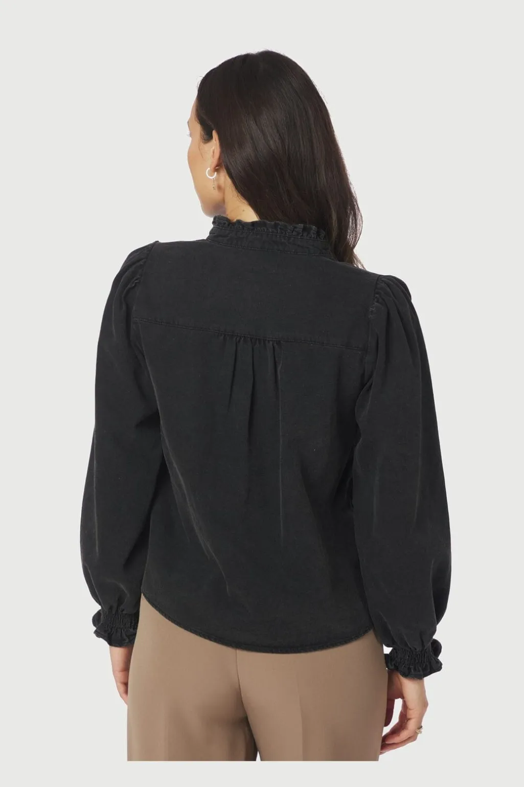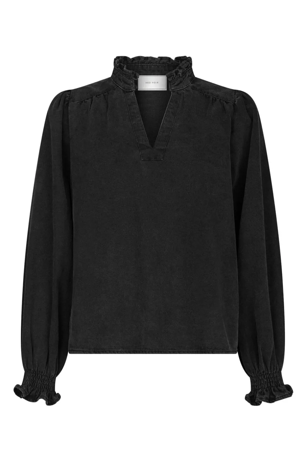 Sort denimbluse fra Neo Noir med V-udskæring og rynket halsudskæring. Blusen har lange ærmer med smock ved manchetterne og en bindebåndslukning foran.