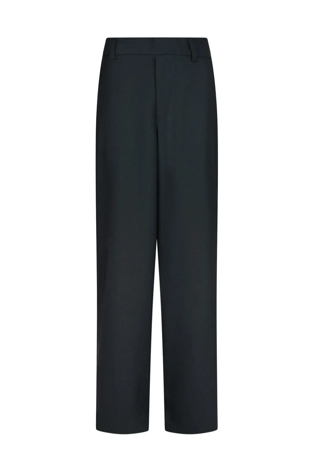 Mørkeblå bukser fra Neo Noir med høj talje og løs pasform. Bukserne har bæltestropper, sidelommer og baglommer. Ankellang model med meleret udtryk.