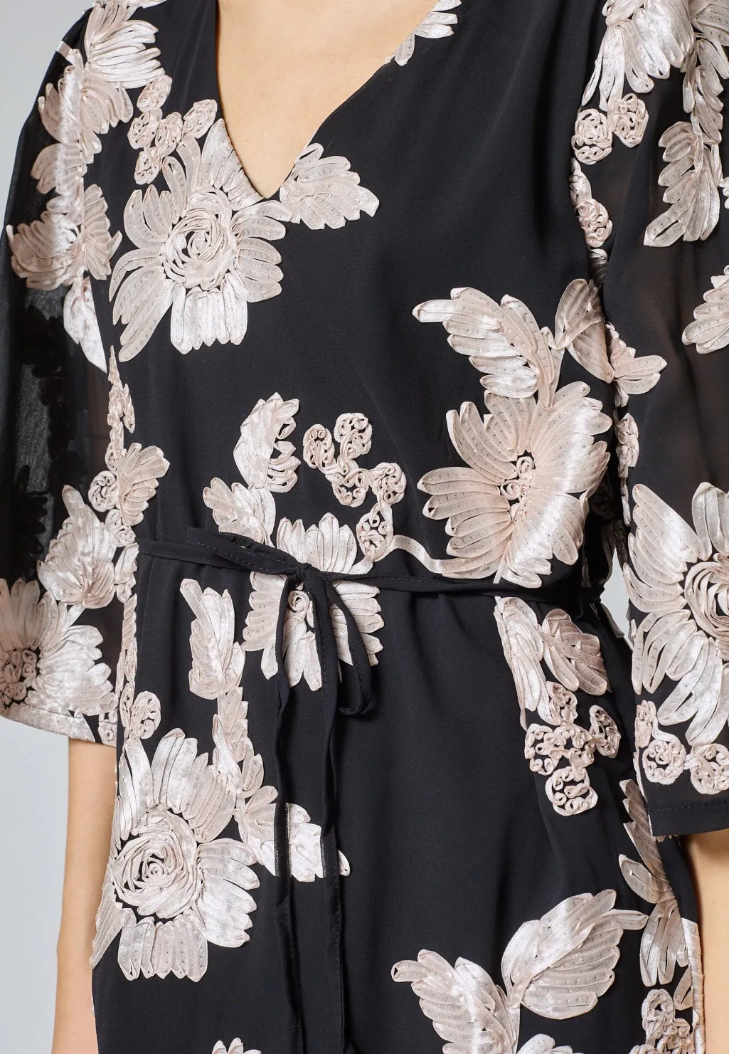 Sort kjole fra Sisters Point med et blomstermønster i champagne-nuancer. Kjolen har V-udskæring, trekvartlange ærmer og er knælang.