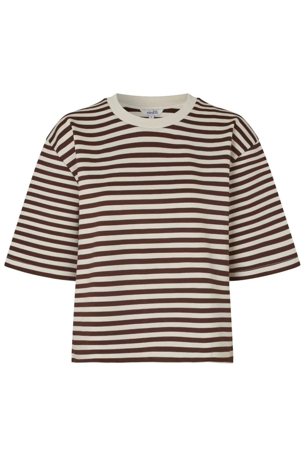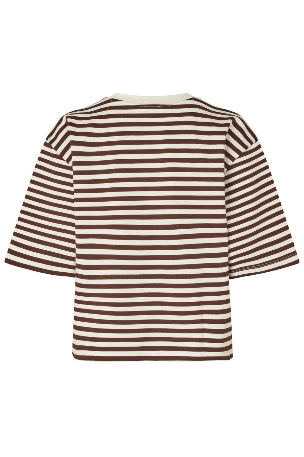 Stribet t-shirt fra MbyM i brune og cremefarvede striber. T-shirten har 3/4-ærmer og en rund halsudskæring.