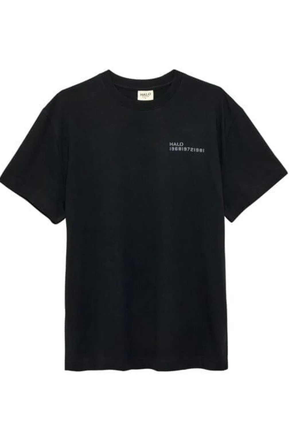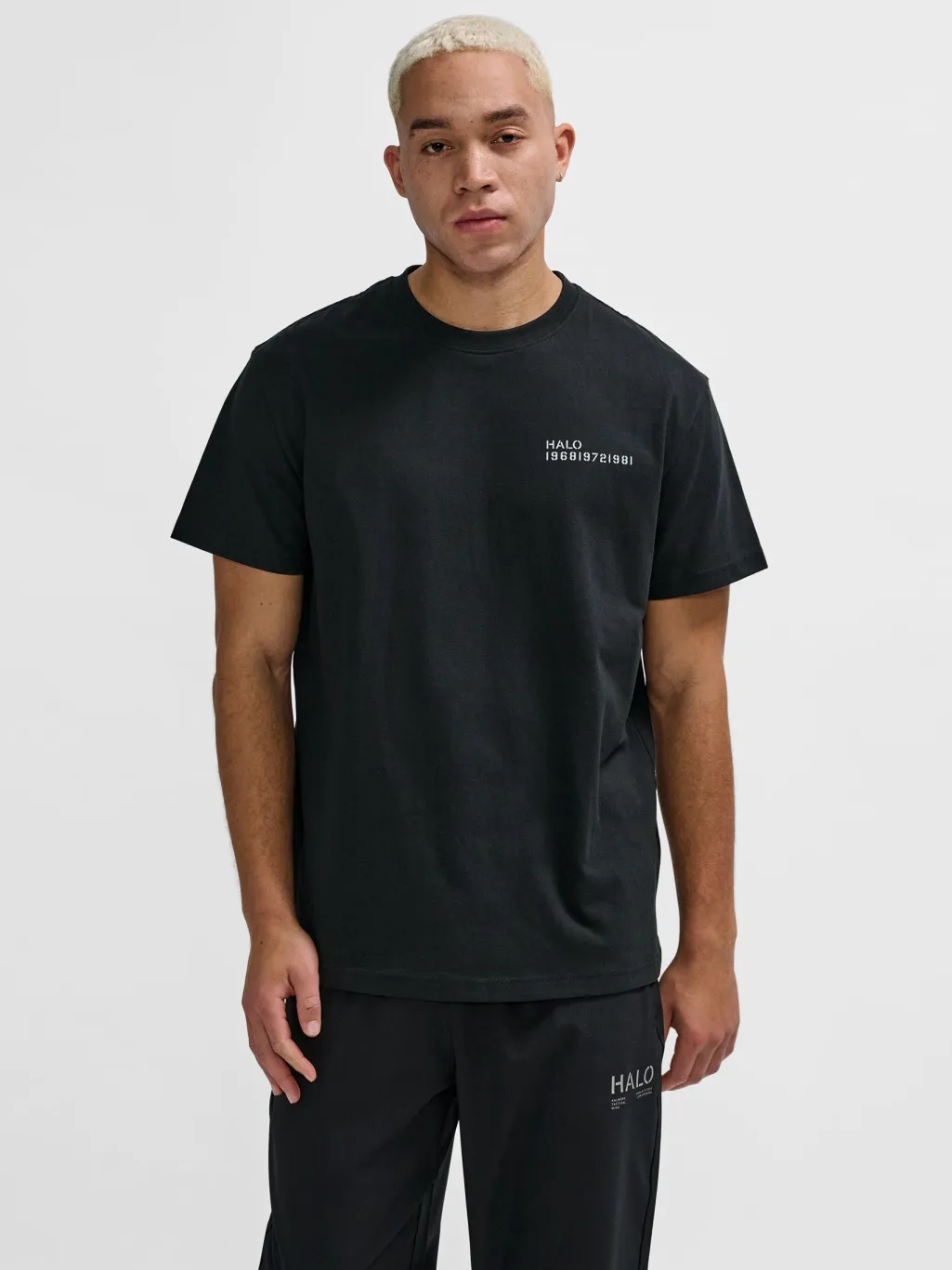 Sort T-shirt fra HALO, lavet af 100 % økologisk bomuld. T-shirten har en løs pasform og et minimalistisk design med HALO-logo print på ryggen.