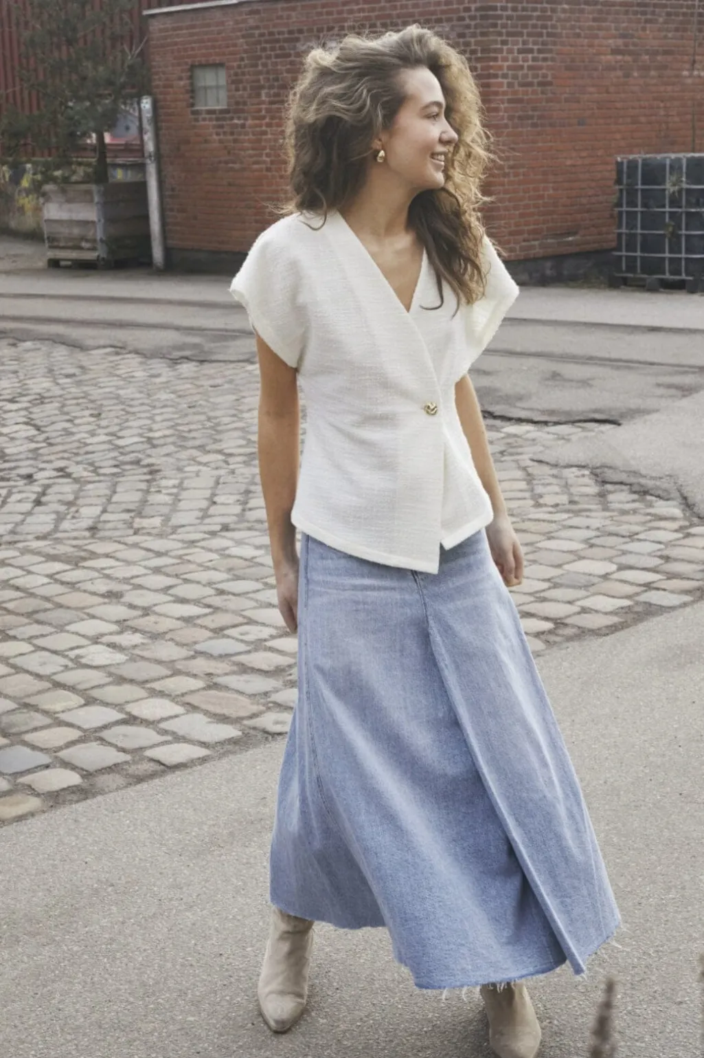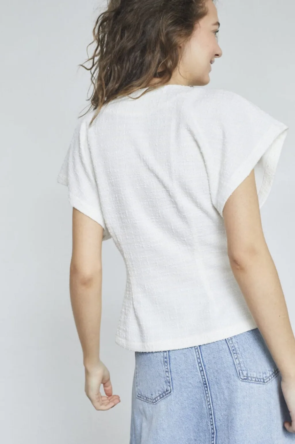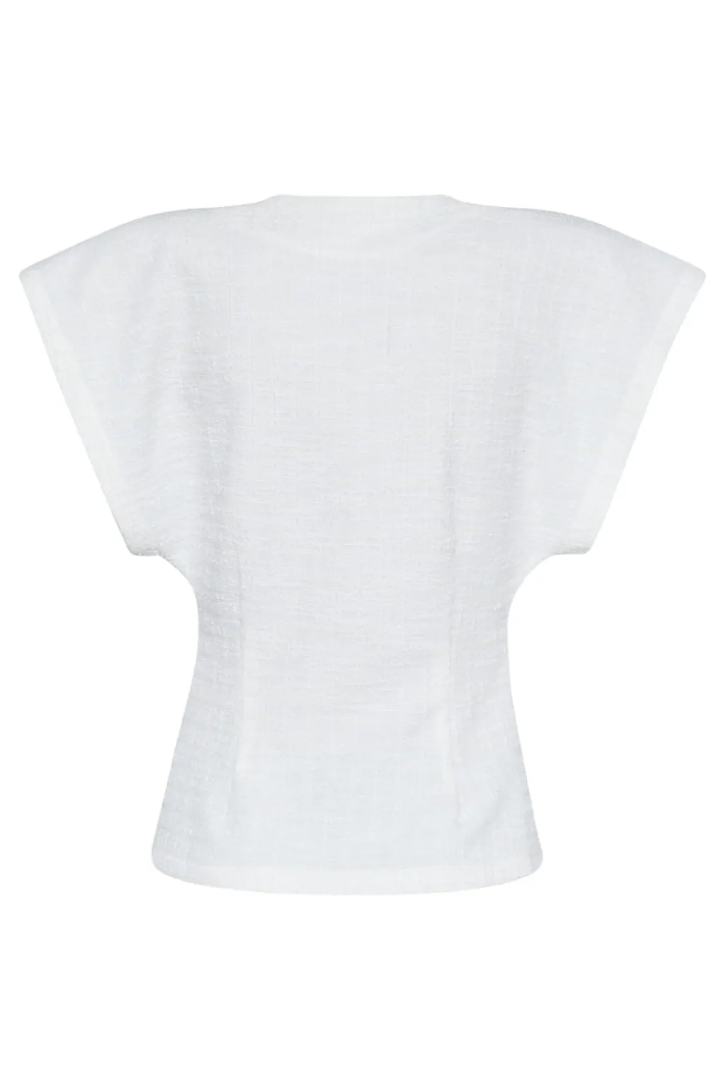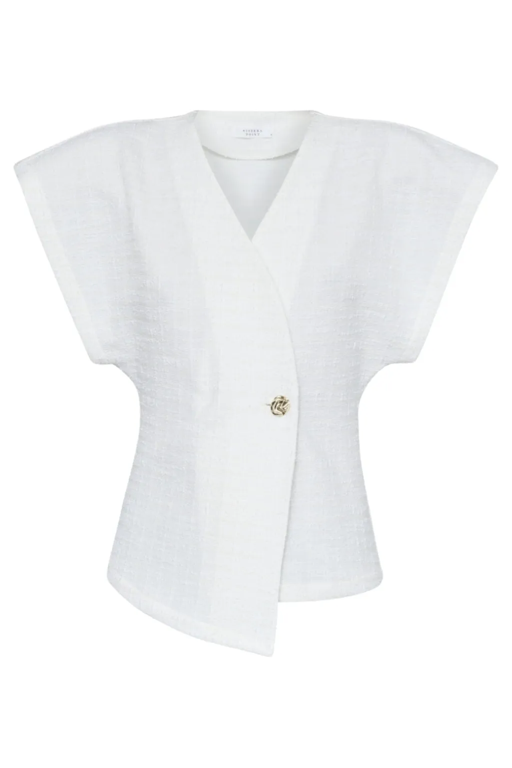 Cremehvid vest fra Sisters Point med slå-om-design og guldknap. De korte, brede ærmer og V-udskæring giver vesten et rent og enkelt udtryk.