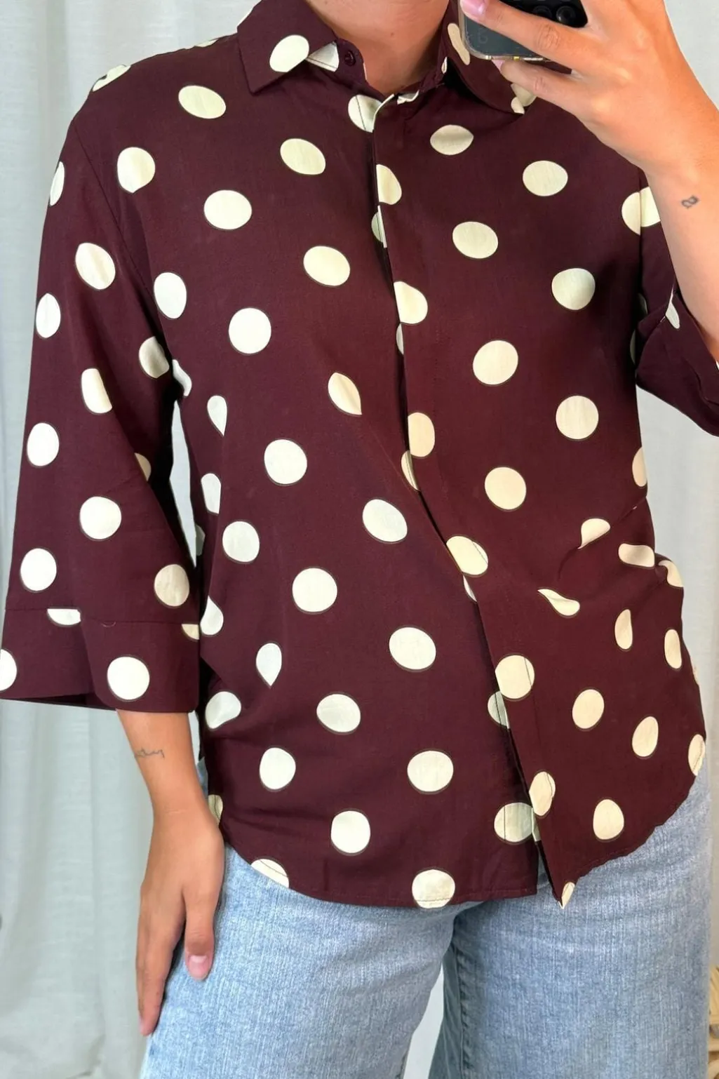 Brun bluse fra A-bee med store hvide polkaprikker. Blusen har en klassisk krave, trekvartlange ærmer og en løs pasform.