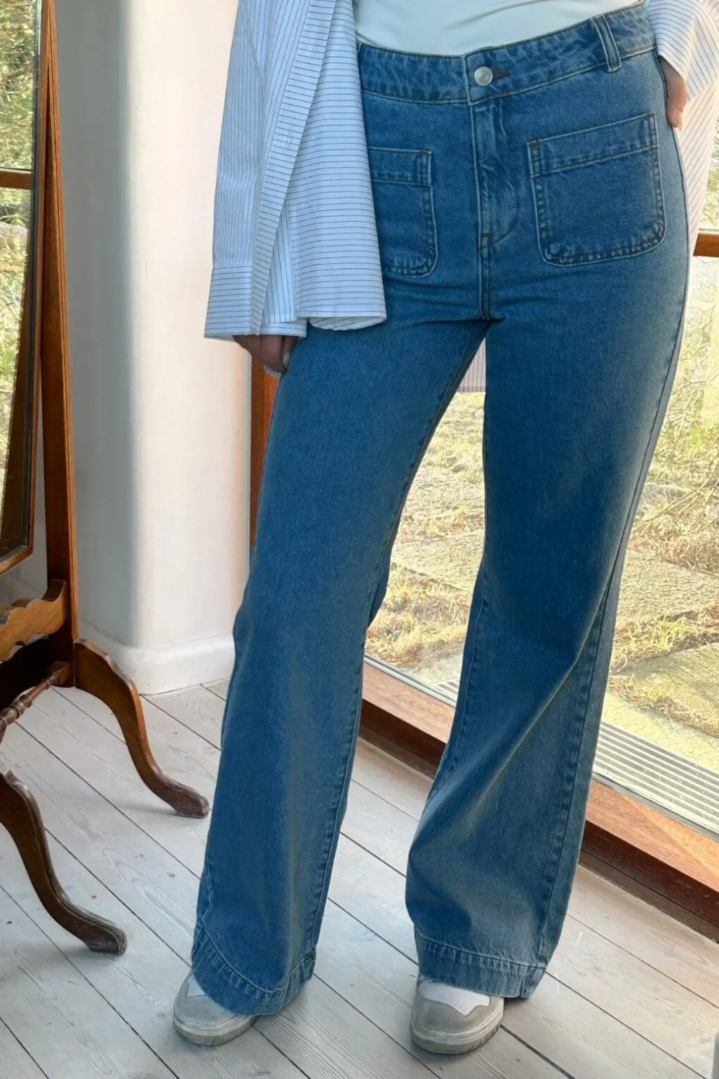 Lyseblå bukser fra Neo Noir i 100 % bomuld. Bukserne har en høj talje med flared ben og karakteristiske baglommer med dekorative syninger.
