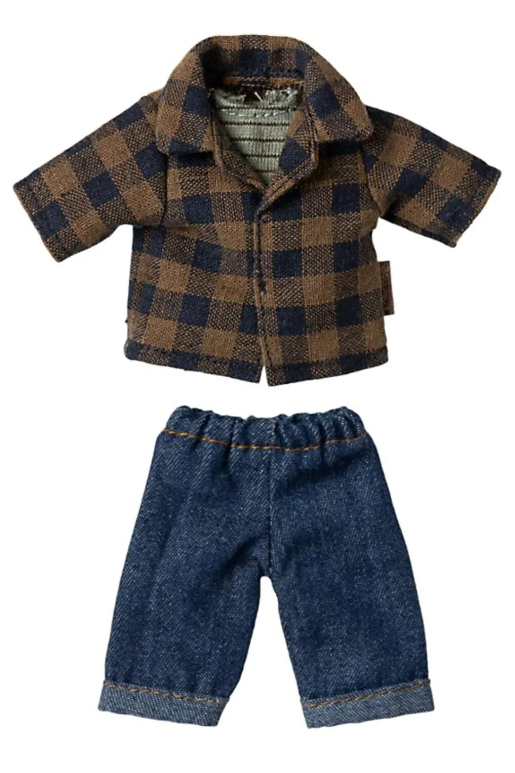 En lysebrun mus fra Maileg med store ører og enkle ansigtstræk. Musen har en ternet skjorte, en tanktop og denimbukser med opsmøg.