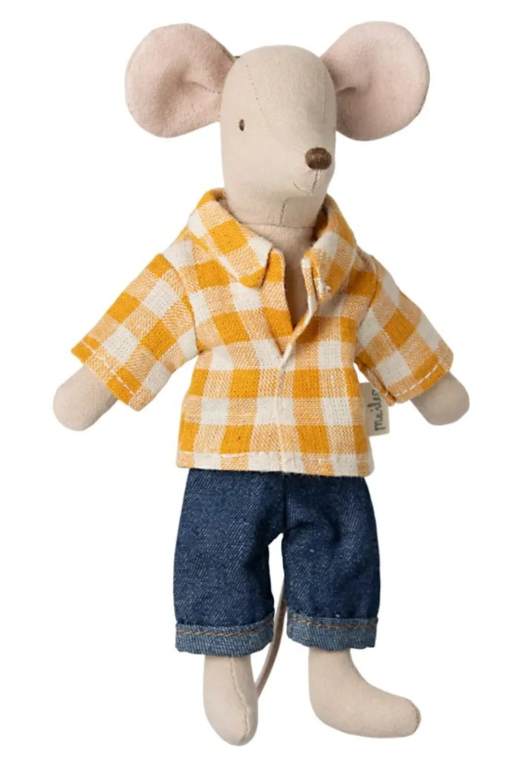 Den gule og hvide ternede skjorte kombineret med blå denimbukser giver musen et genkendeligt hverdagslook til leg og historiefortælling.