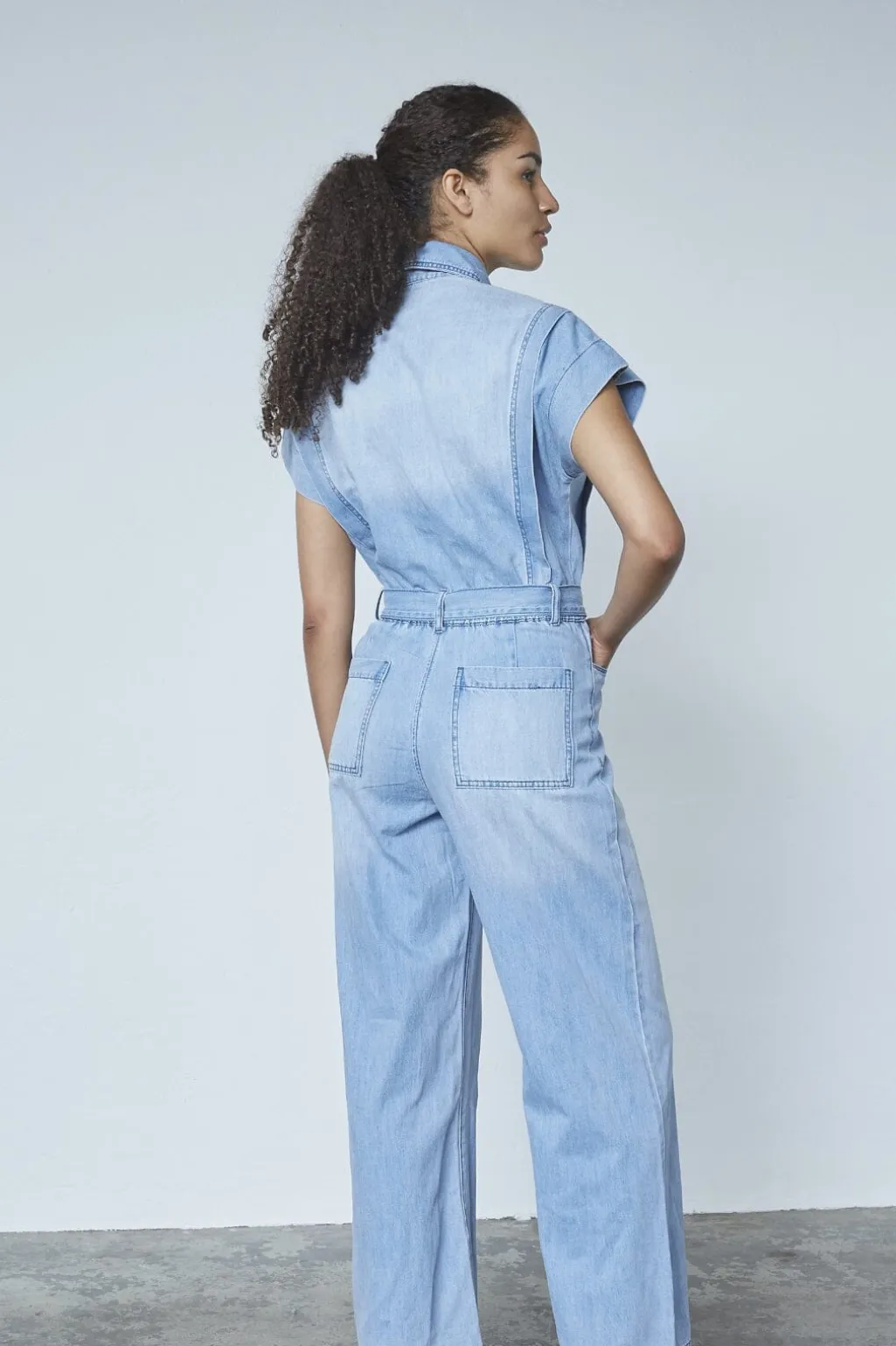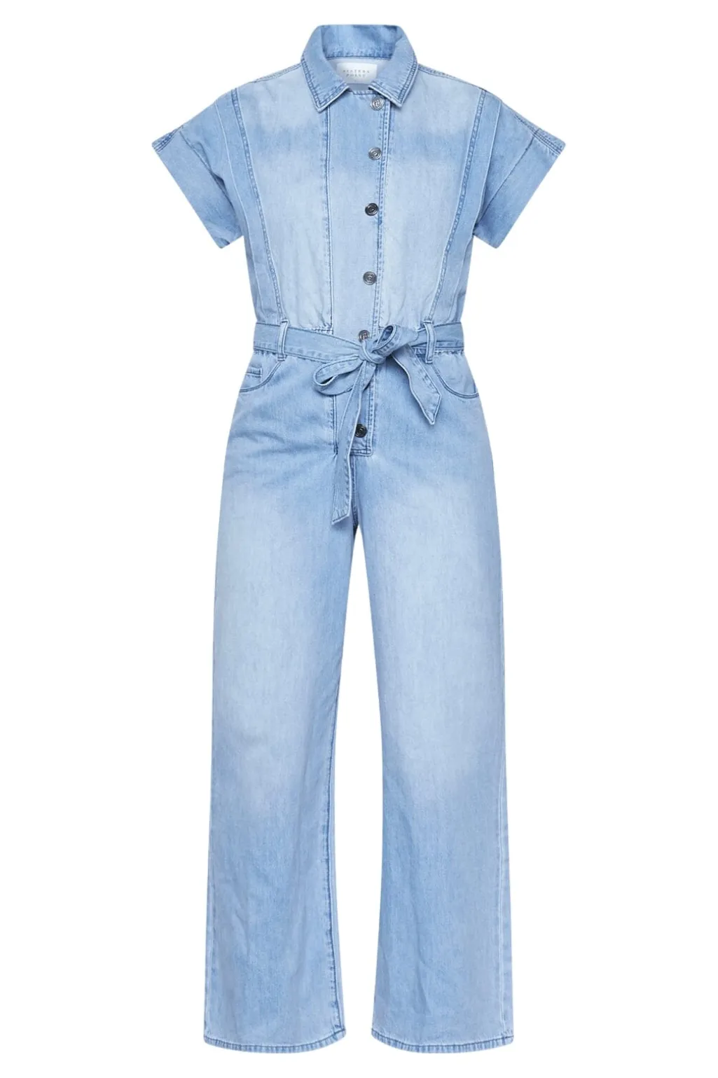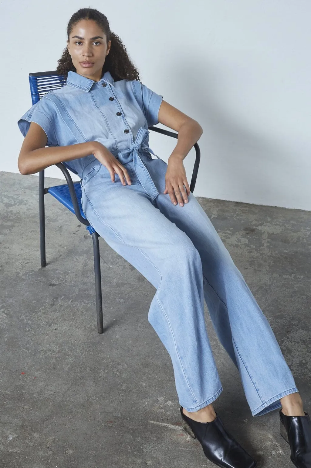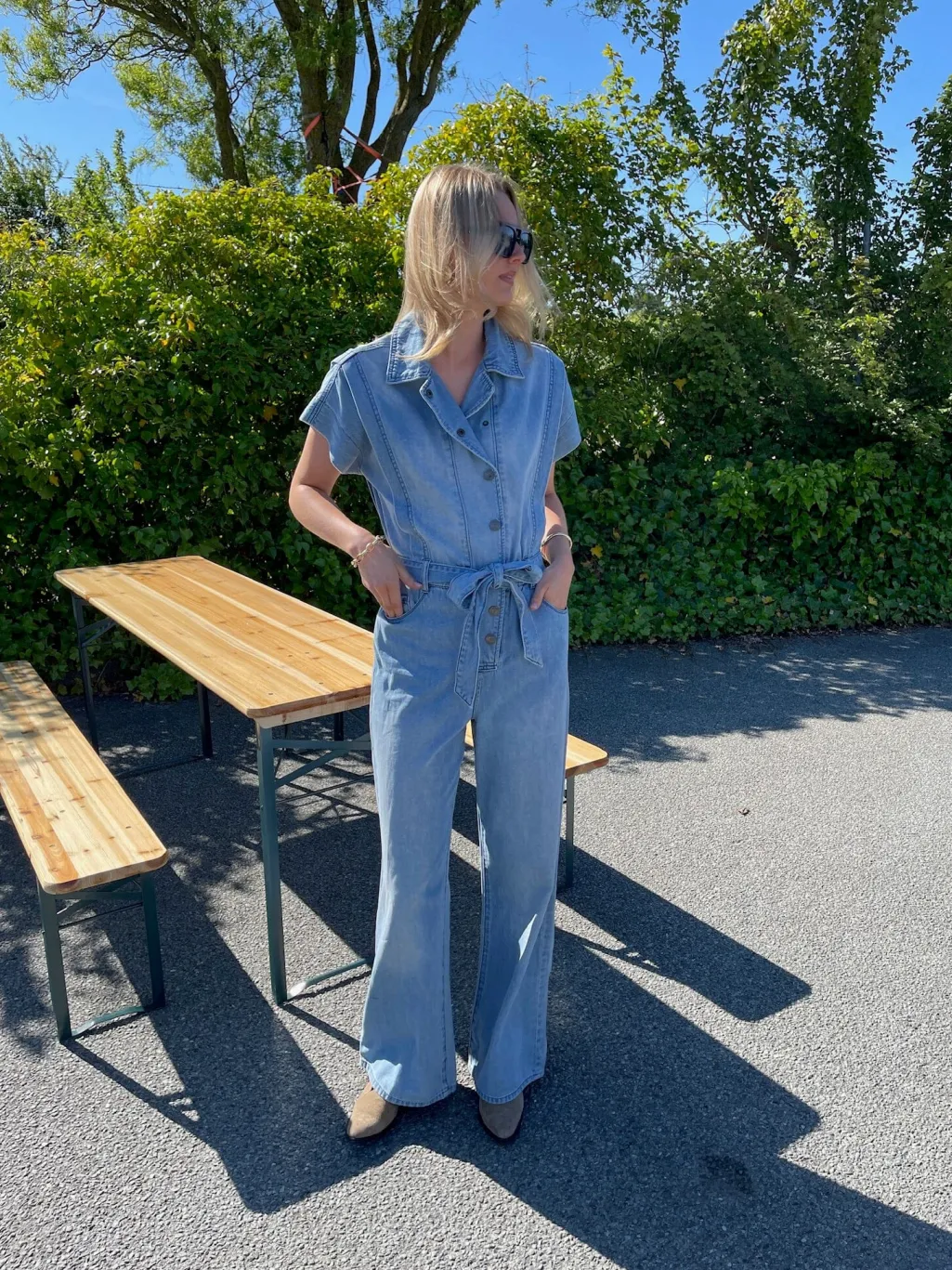 Lys blå denim jumpsuit fra Sisters Point med skjortekrave og korte ærmer. Jumpsuiten har en løs pasform og går til anklerne.