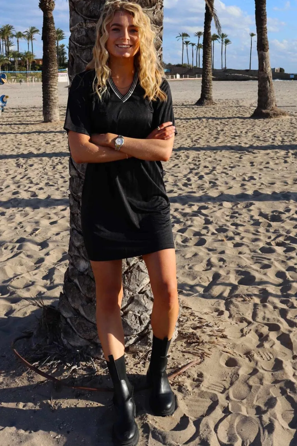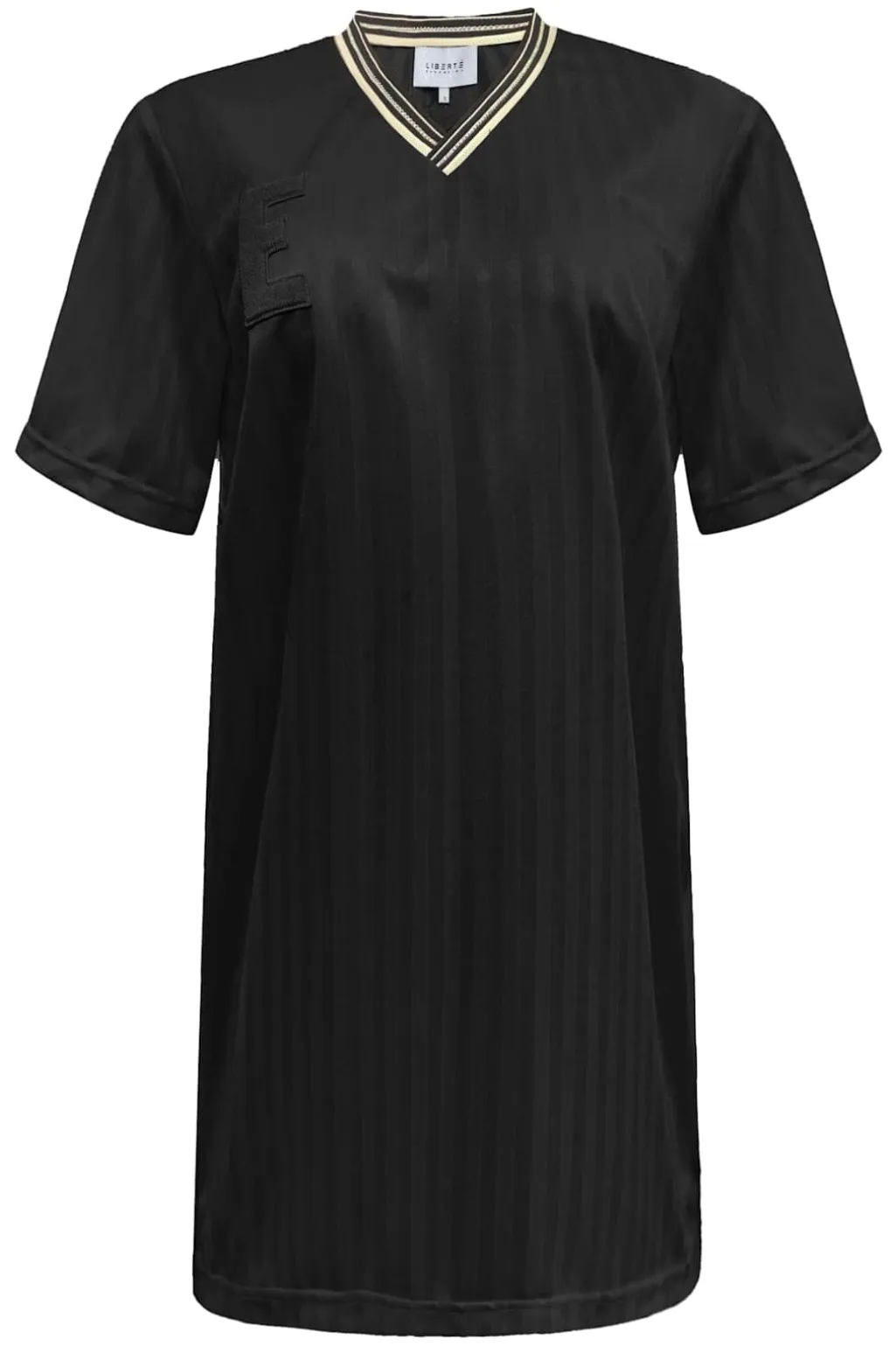Sort kjole fra Liberte med løs pasform og V-hals. Kjolen har korte ærmer og en lårlængde, der gør den praktisk til hverdagsbrug.
