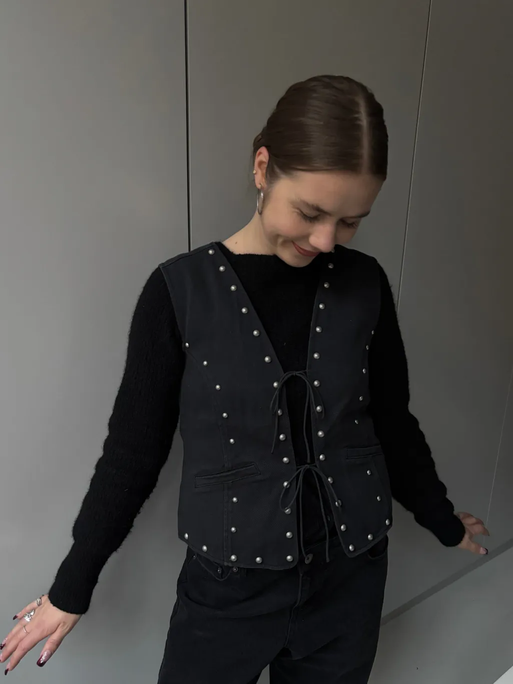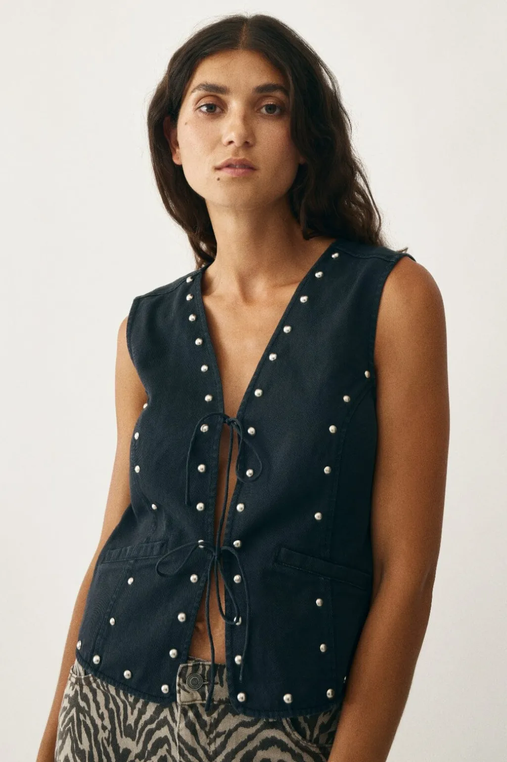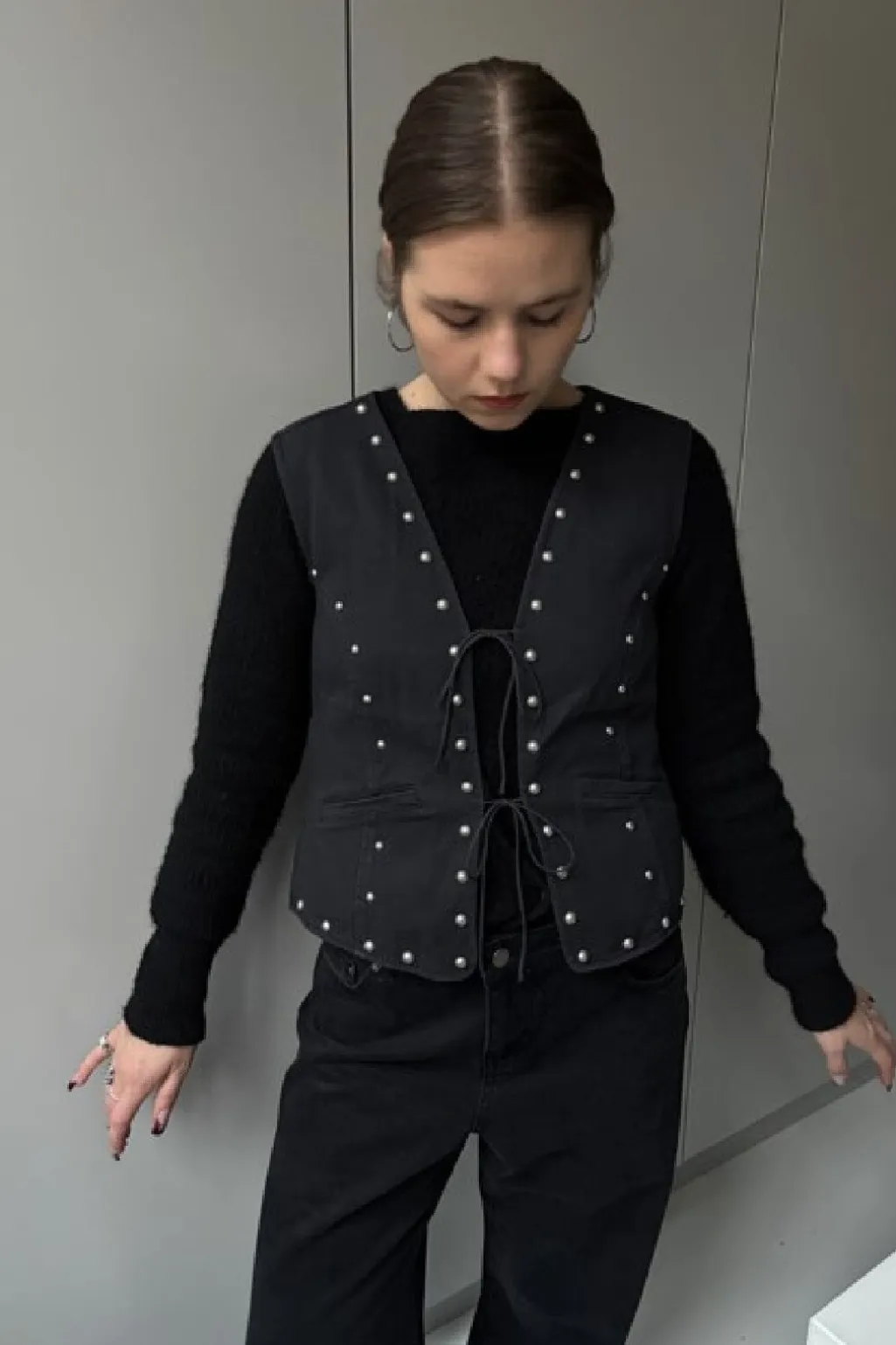 Ærmeløs vest fra Global Funk i vasket sort bomuld. Vesten har en V-udskæring, perledetaljer langs kanten og en snørelukning i midten. To praktiske lommer fuldender designet.