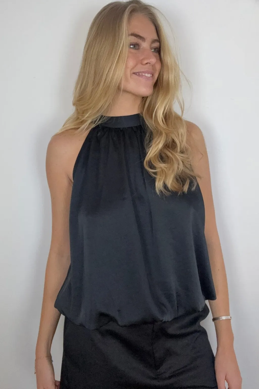 Sort, ærmeløs top fra Continue med høj halsudskæring og løs pasform. Stoffet er let skinnende og lavet af en blanding af viskose og polyester.