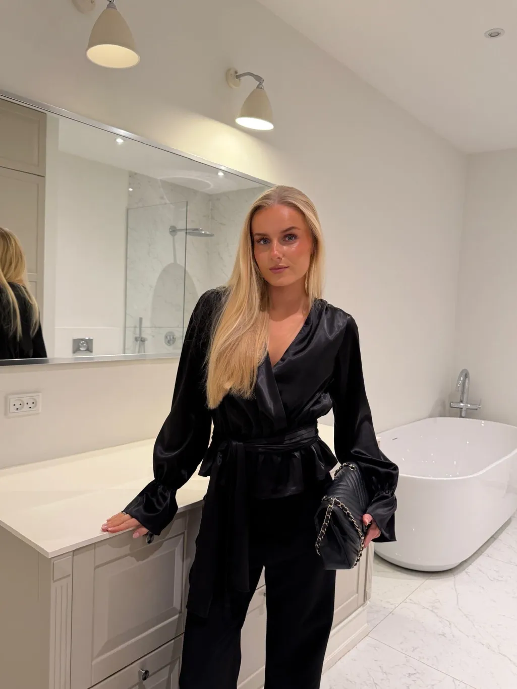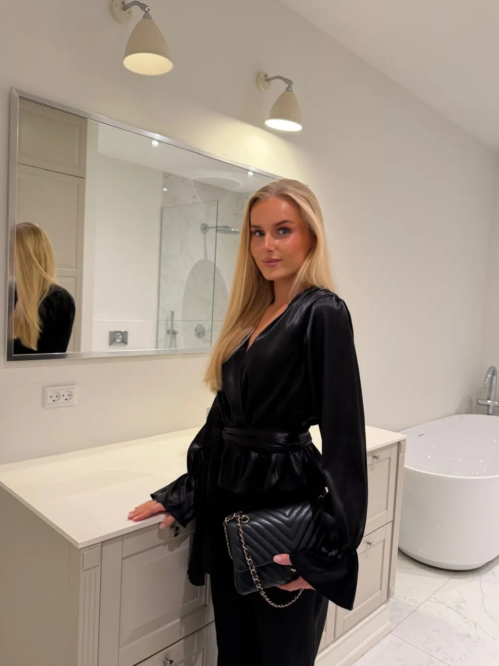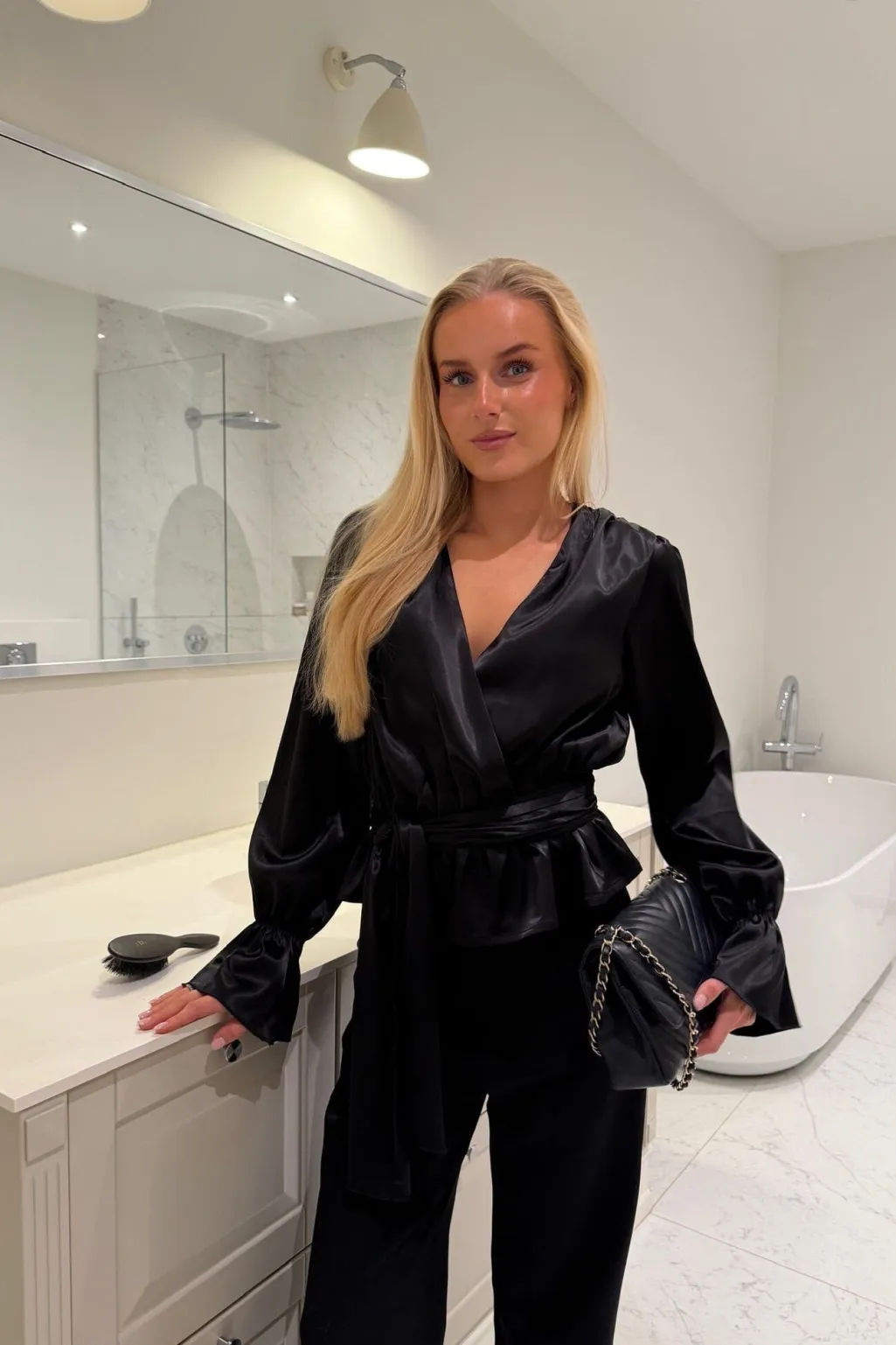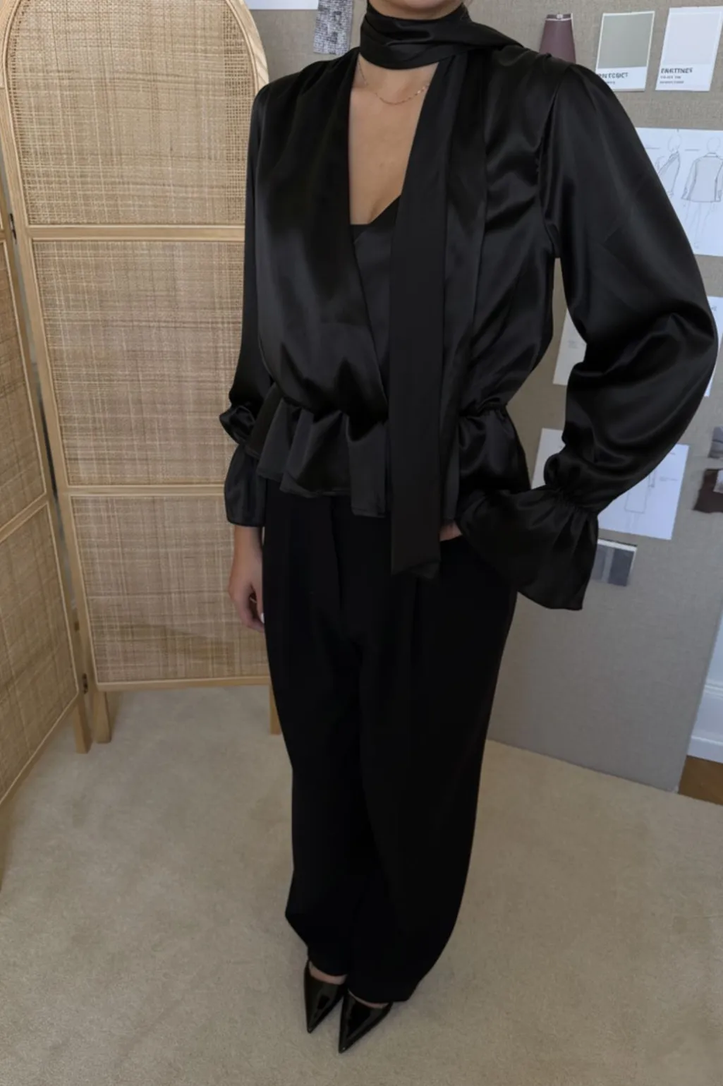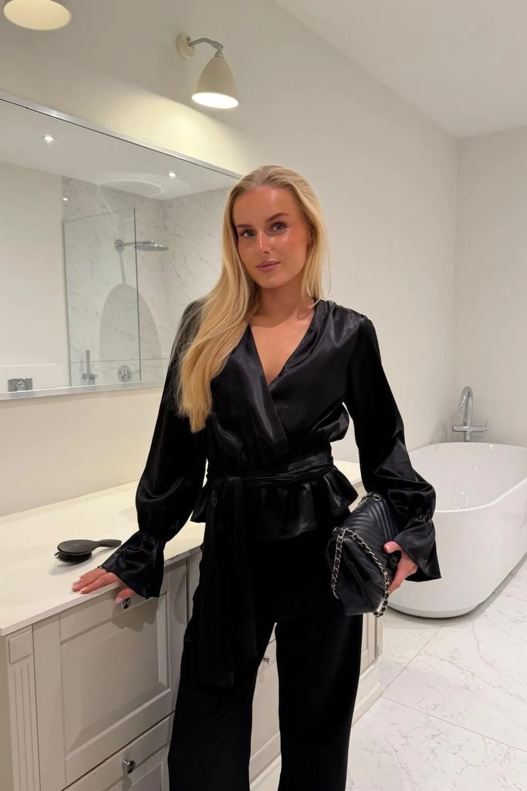 Sort satinskjorte fra BYIC med V-udskæring og bindebånd. Skjorten har en løs pasform med markeret talje og puffede ærmer med elastiske manchetter.