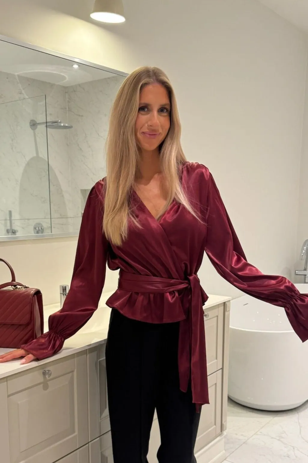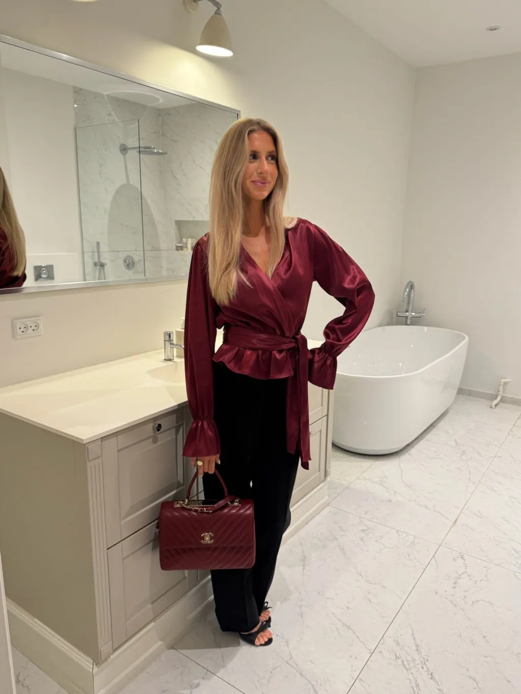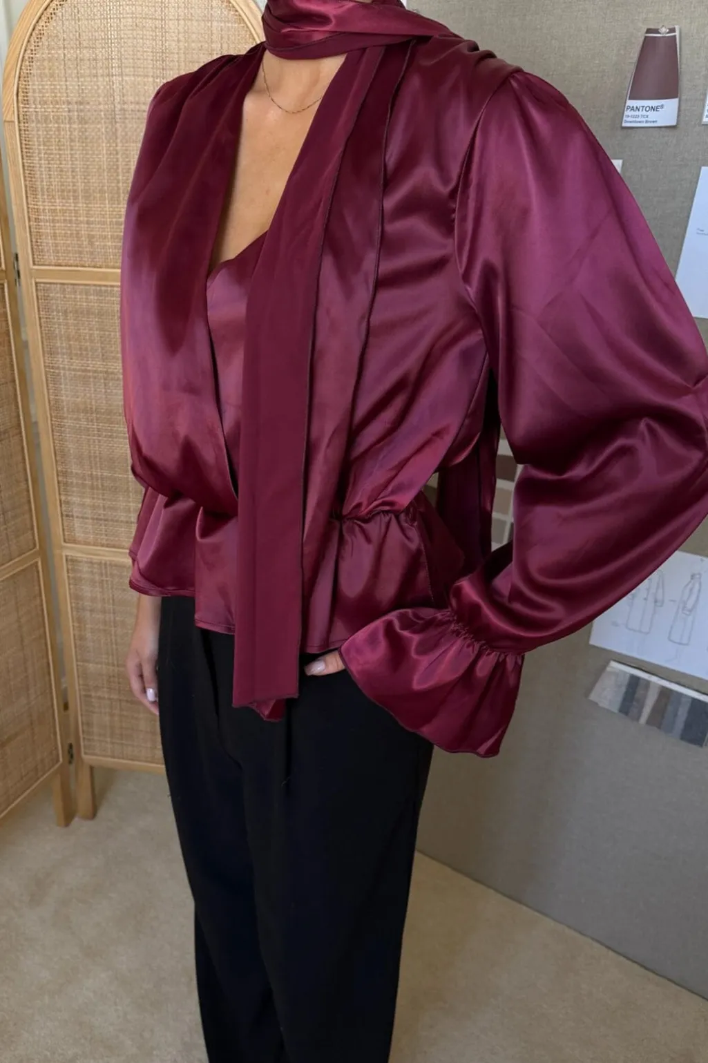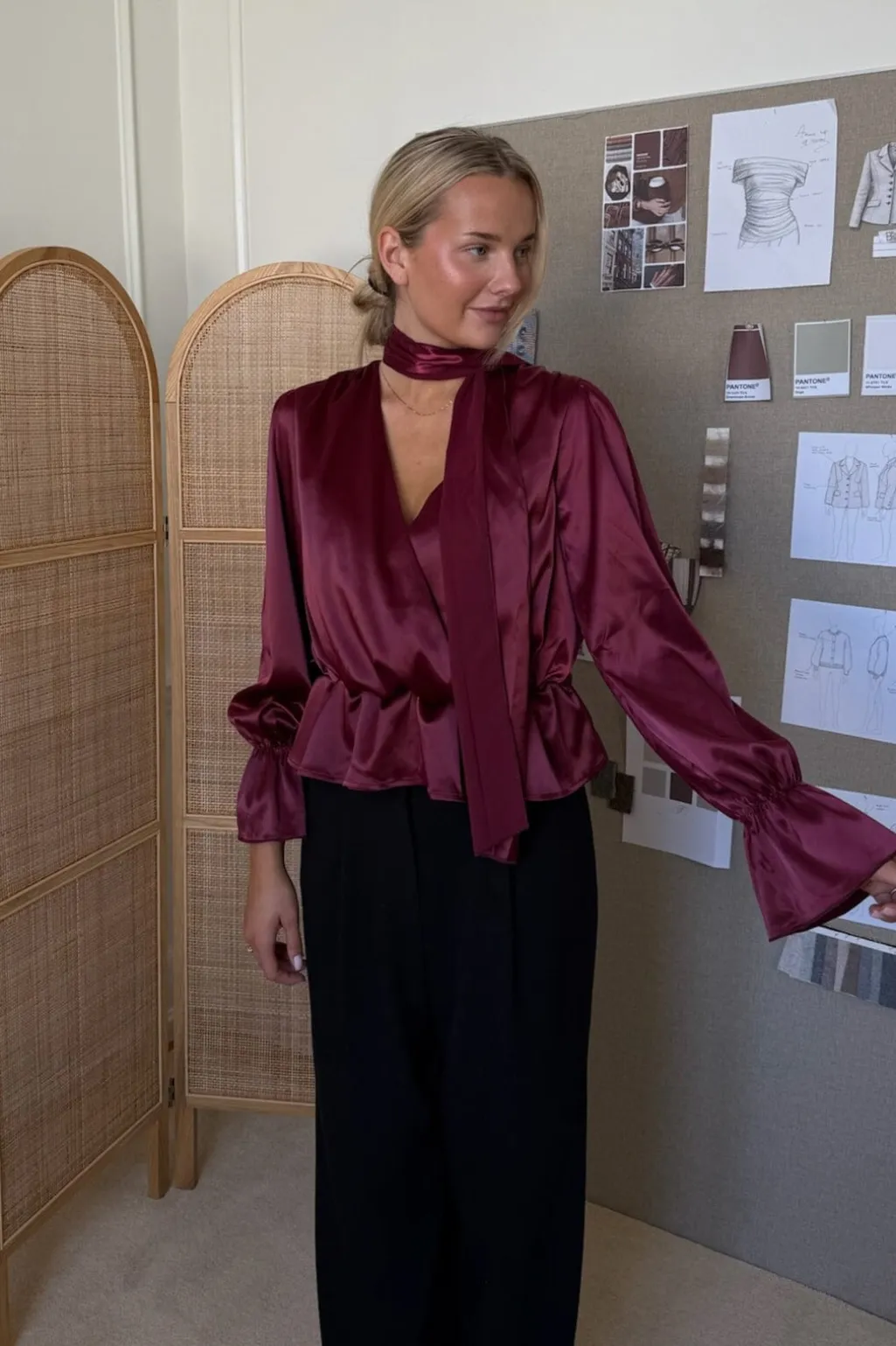 Bordeauxfarvet skjorte fra BYIC i skinnende satin. Skjorten har en dyb V-udskæring med bindebånd ved halsen og flæsekant langs kanten.
