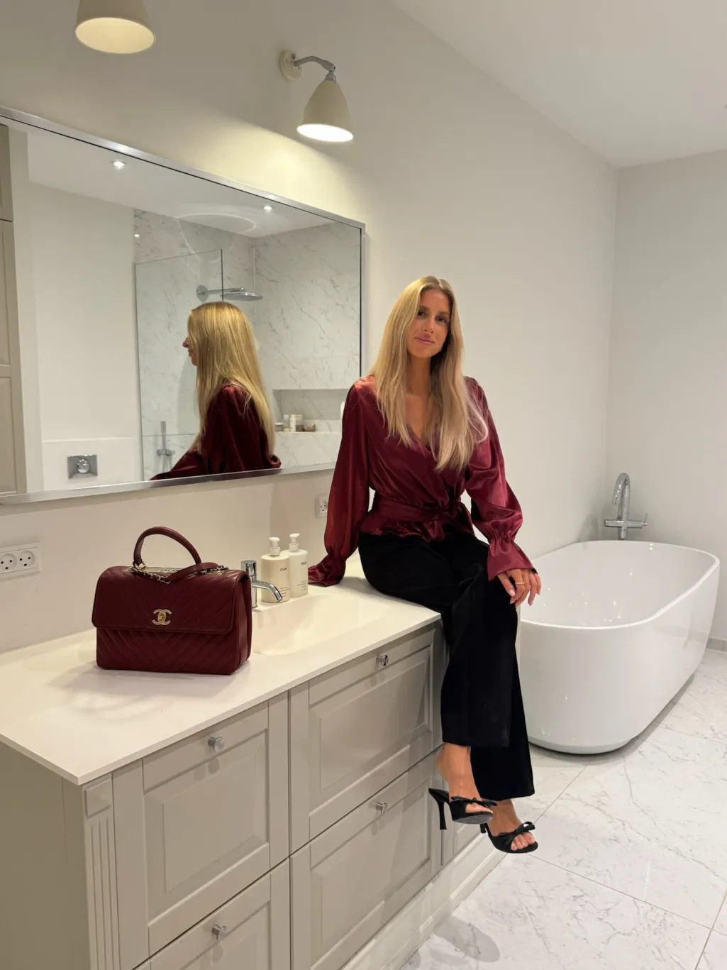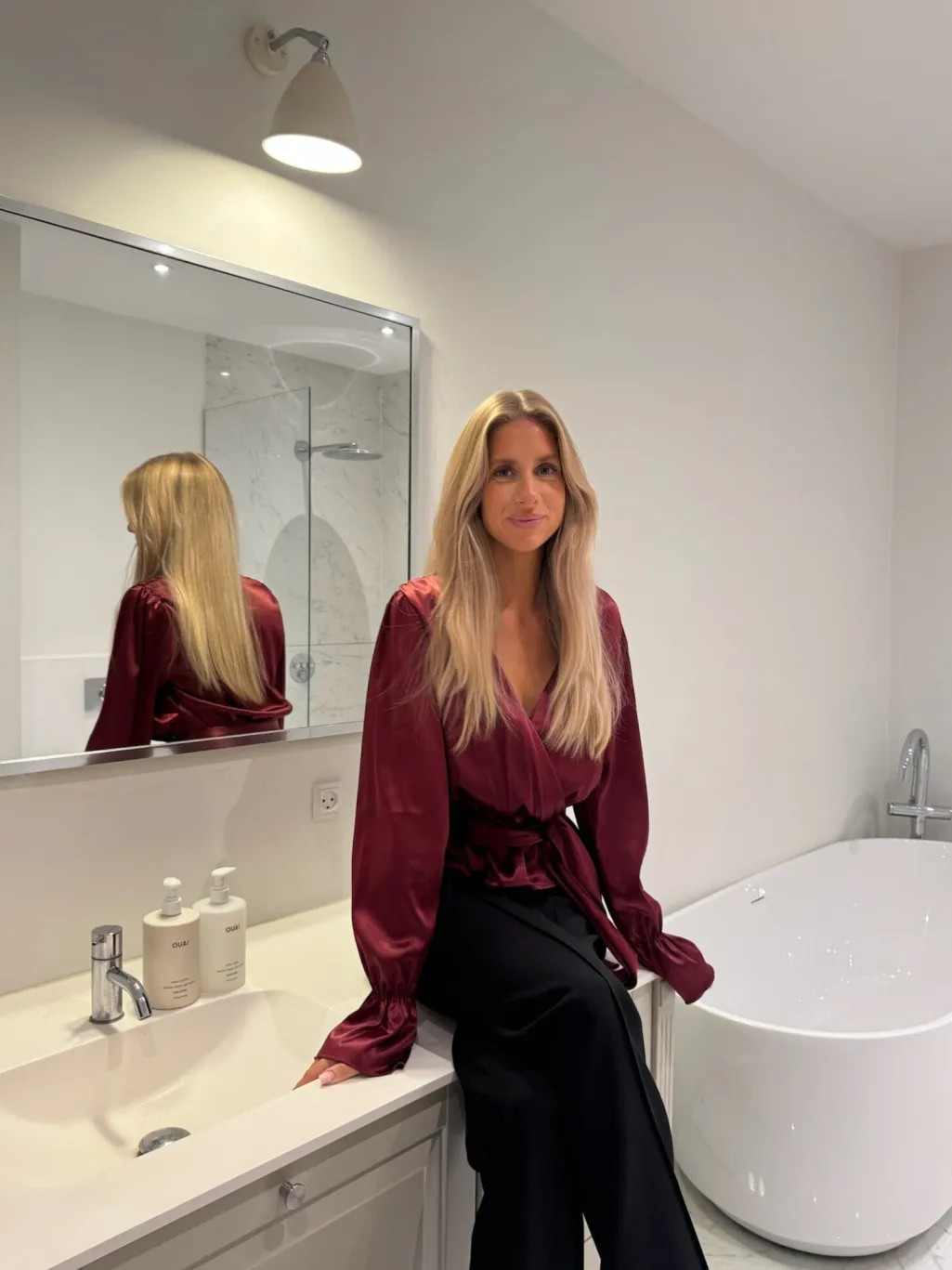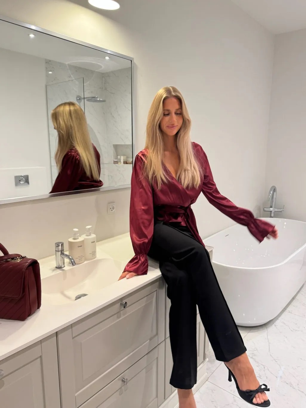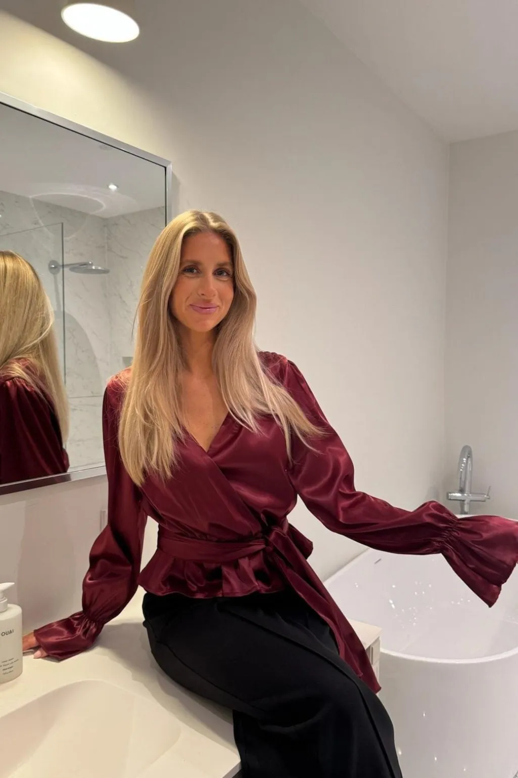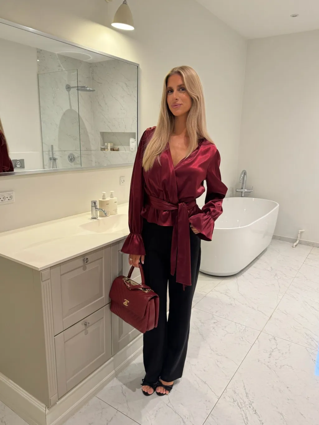 Bordeauxfarvet skjorte fra BYIC i skinnende satin. Skjorten har en dyb V-udskæring med bindebånd ved halsen og flæsekant langs kanten.
